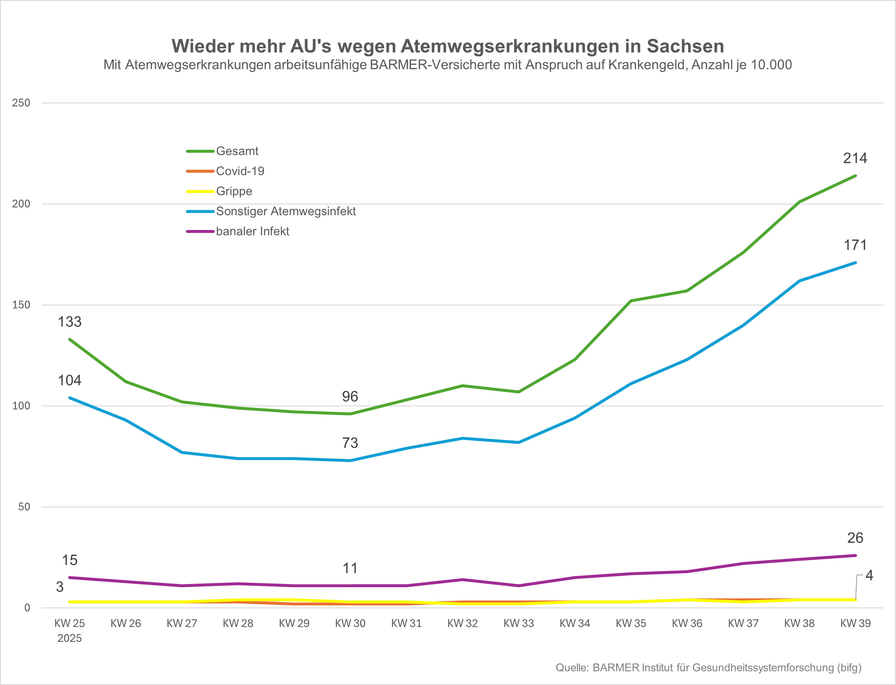 Seit Mitte August steigt die Anzahl der atemwegsbedingten Krankschreibungen in Sachsen wieder deutlich an, wie eine Auswertung des Barmer-Instituts für Gesundheitssystemforschung (bifg) zeigt.