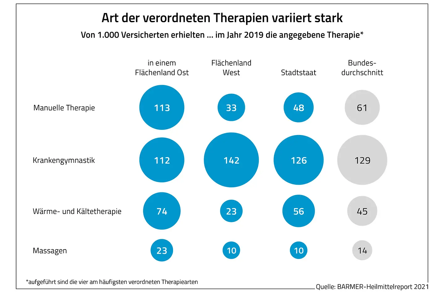 Patientinnen und Patienten der östlichen Bundesländer bekämen laut Barmer häufiger ein Heilmittel verordnet als Gleichaltrige in den westlichen Bundesländern und den Stadtstaaten. Das gelte vor allem für Physio- und Ergotherapie. Bei der Logopädie gebe es hingegen eine andere regionale Verteilung. Hier sei wiederum Bremen Schlusslicht im Vergleich zum Bundesdurchschnitt (-19 Prozent), während Nordrhein-Westfalen die meisten Logopädie-Patienten aufweisen könne (+18 Prozent). „Die regionalen Unterschiede zeigen, dass bei Heilmitteln mehr Transparenz erforderlich ist. Dies würde deren patientenorientierten Einsatz weiter stärken“, sagt Dr. Fabian Magerl.