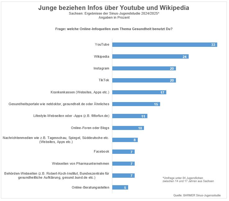 Im Freistaat nutzten 33 Prozent YouTube, 24 Prozent Wikipedia, gefolgt TikTok und Instagram, die von 20 Prozent als Online-Infoquellen für Gesundheitsthemen genutzt wurden.