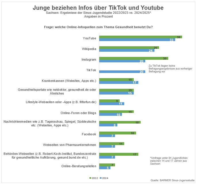 Junge Menschen beziehen ihre Gesundheitsinformationen vor allem von TikTok, YouTube und Wikipedia. Das geht aus der repräsentativen Sinus-Jugendstudie 2024/2025 im Auftrag der Barmer hervor, für die im Herbst 2024 bundesweit rund 2.000 Jugendliche zwischen 14 und 17 Jahren befragt wurden, darunter 84 aus Sachsen.