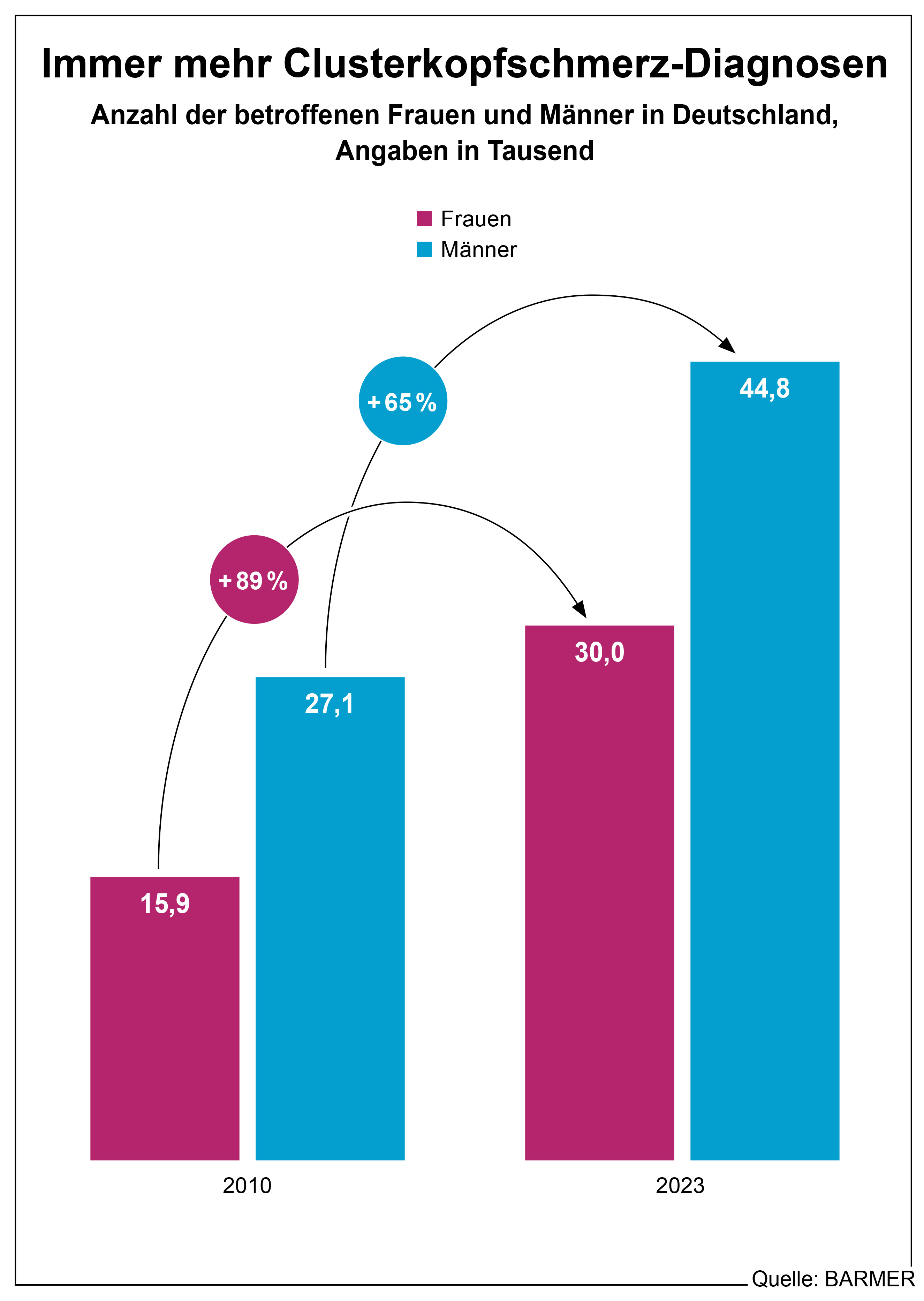 21. August 2025 - Eine aktuelle Auswertung der Barmer zeigt, dass sich die Betroffenenzahlen mehr als verdoppelt haben: 2010 litten rund 1.400 Personen in Sachsen daran, 2023 waren es etwa 2.900. Anders als bei der Migräne, leiden mehr Männern als Frauen darunter.