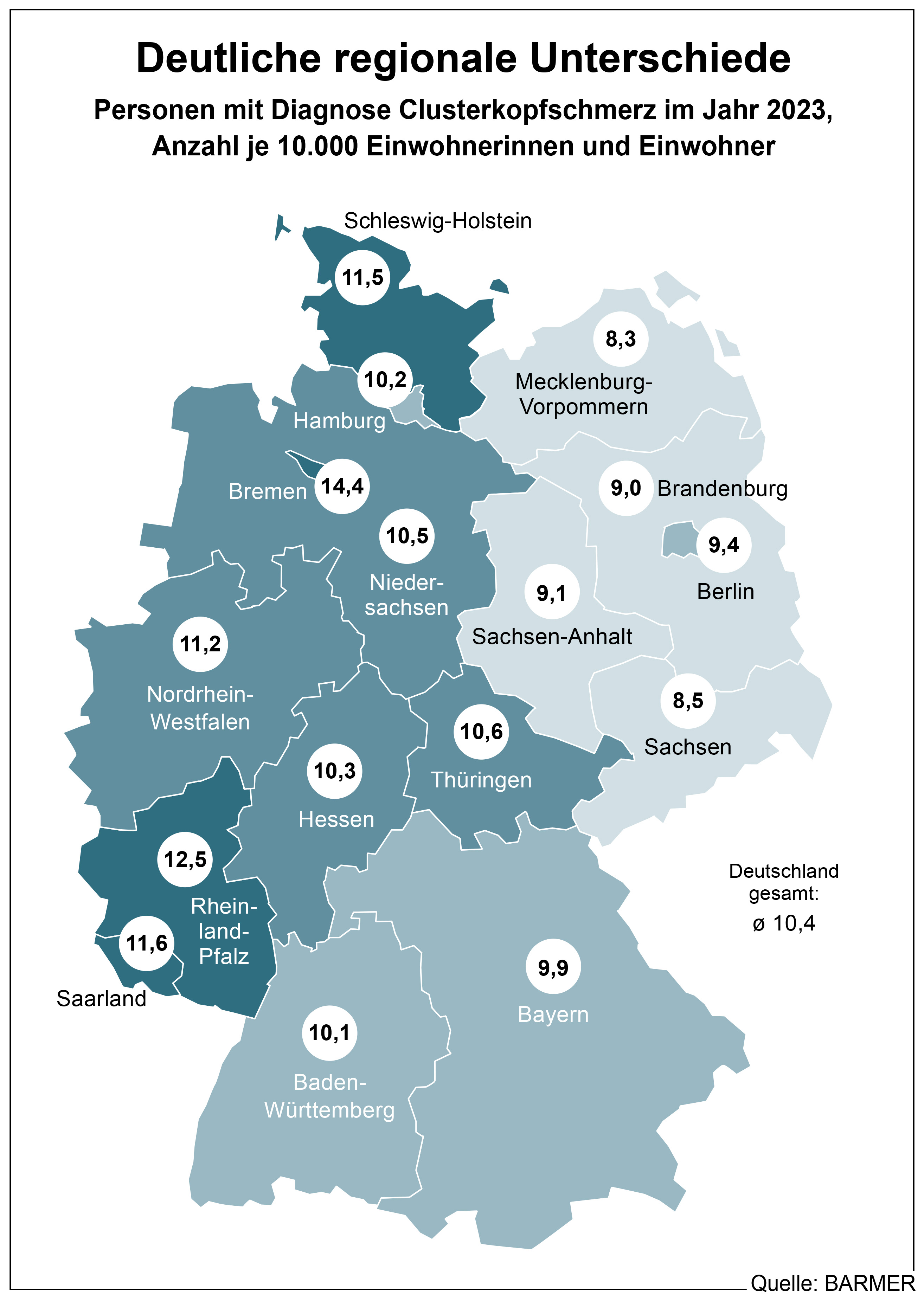 Wie aus der Barmer-Analyse weiter hervorgeht, gibt es deutliche regionale Unterschiede beim Auftreten von Clusterkopfschmerz. Am häufigsten wurde die Diagnose im Jahr 2023 in Bremen und Rheinland-Pfalz mit 14,4 und 12,5 Betroffenen je 10.000 Personen gestellt und am seltensten in Mecklenburg-Vorpommern und Sachsen mit 8,3 und 8,5 je 10.000 Personen.