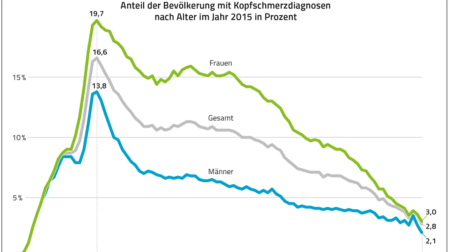 Kopfschmerzdiagnosen sind bei Kindern rückläufig, bei jungen Erwachsenen allerdings um alarmierende 42 Prozent gestiegen. Bis zu einem Alter von acht Jahren finden sich bei Jungen und Mädchen nahezu identische Kopfschmerzdiagnosehäufigkeiten. Bei beiden Geschlechtern zeigt sich im Alter zwischen 11 und 13 Jahren ein Plateau mit stagnierenden Kopfschmerzdiagnosehäufigkeiten um gut acht Prozent bei Jungen und neun Prozent bei Mädchen. Mit weiter steigendem Alter kommt es zunächst bei Mädchen und dann verzögert auch bei Jungen zu einer steilen Zunahme der Kopfschmerzhäufigkeit. Die höchsten Kopfschmerzdiagnoseraten zeigen sich mit gut 14 Prozent bei jungen Männern und gut 20 Prozent bei jungen Frauen im Alter von 19 Jahren.