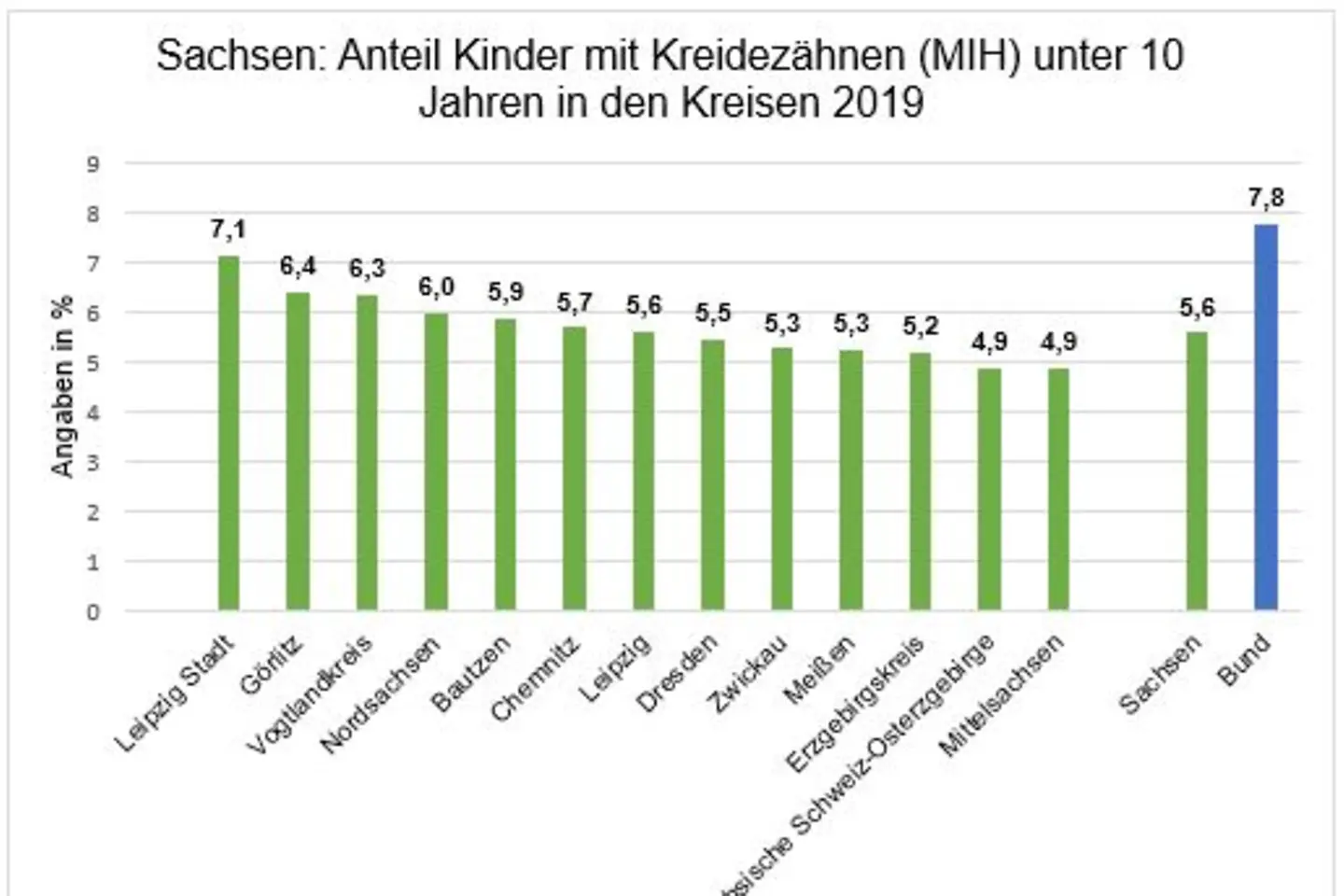 Neben der Ursachenforschung liefert der Barmer-Zahnreport eine Bestandsaufnahme zum Phänomen der Kreidezähne. Betroffen sind demnach häufiger Mädchen als Jungen. Zwischen den Jahren 2012 bis 2019 hatten 9,1 Prozent der Mädchen und 7,6 Prozent der Jungen in Deutschland eine so schwere Form der Kreidezähne, dass sie in zahnärztlicher Behandlung waren. Auch gibt es regional deutliche Unterschiede. In Sachsen habe man Kreidezähne am häufigsten bei Kindern aus Leipzig festgestellt. Dort seien mehr als sieben Prozent in dieser Altersgruppe betroffen. Am geringsten sei die Prävalenz in Mittelsachsen und im Kreis Sächsische Schweiz-Osterzgebirge (4,9 Prozent). Dr. Magerl: „Im Vergleich der Bundesländer deutschlandweit gibt es erfreulicher Weise nur in Hamburg noch weniger betroffene Kinder als in Sachsen. Allerdings können wir diese regionalen Unterschiede aktuell noch nicht erklären.“