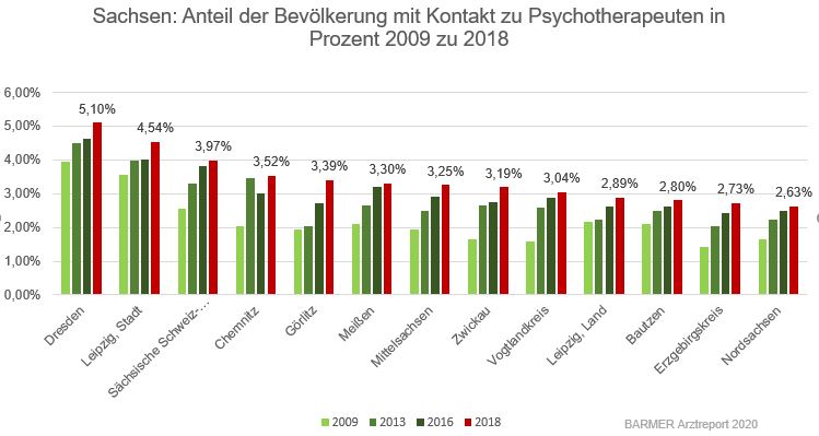 In Sachsen kümmerten sich im Jahr 2018 über 1.200 Psychotherapeutinnen und Psychotherapeuten um die Versorgung Betroffener. Seit 2013 stieg die Zahl um 28 Prozent. (Report, Seite 179) „Leider kommt die steigende Anzahl der Therapeuten nicht eins zu eins in der Versorgung an. Es arbeiten deutlich mehr Psychotherapeutinnen und Psychotherapeuten in den Städten, eher seltener auf dem Land, wo die Versorgungslage zum Teil deutlich kritischer ist“, sagt Magerl. Sachsenweit wurden 2018 beispielsweise in Dresden und Leipzig die meisten Therapeuten erfasst. In Nordsachsen, dem Vogtlandkreis, Leipziger Land und Meißen dagegen sachsenweit die wenigsten. „Leider hat die bisherige Reform nichts an der Tatsache geändert, dass Menschen auf dem Land nicht die gleiche Versorgung zur Verfügung steht, wie Menschen mit vergleichbaren Erkrankungsdiagnosen in Städten. Patienten in Regionen mit hoher Therapeutendichte haben größere Chancen auf Kontakte zu Psychotherapeuten und nachfolgende Therapien“, mahnt Magerl. (Report. Seite 209/231)