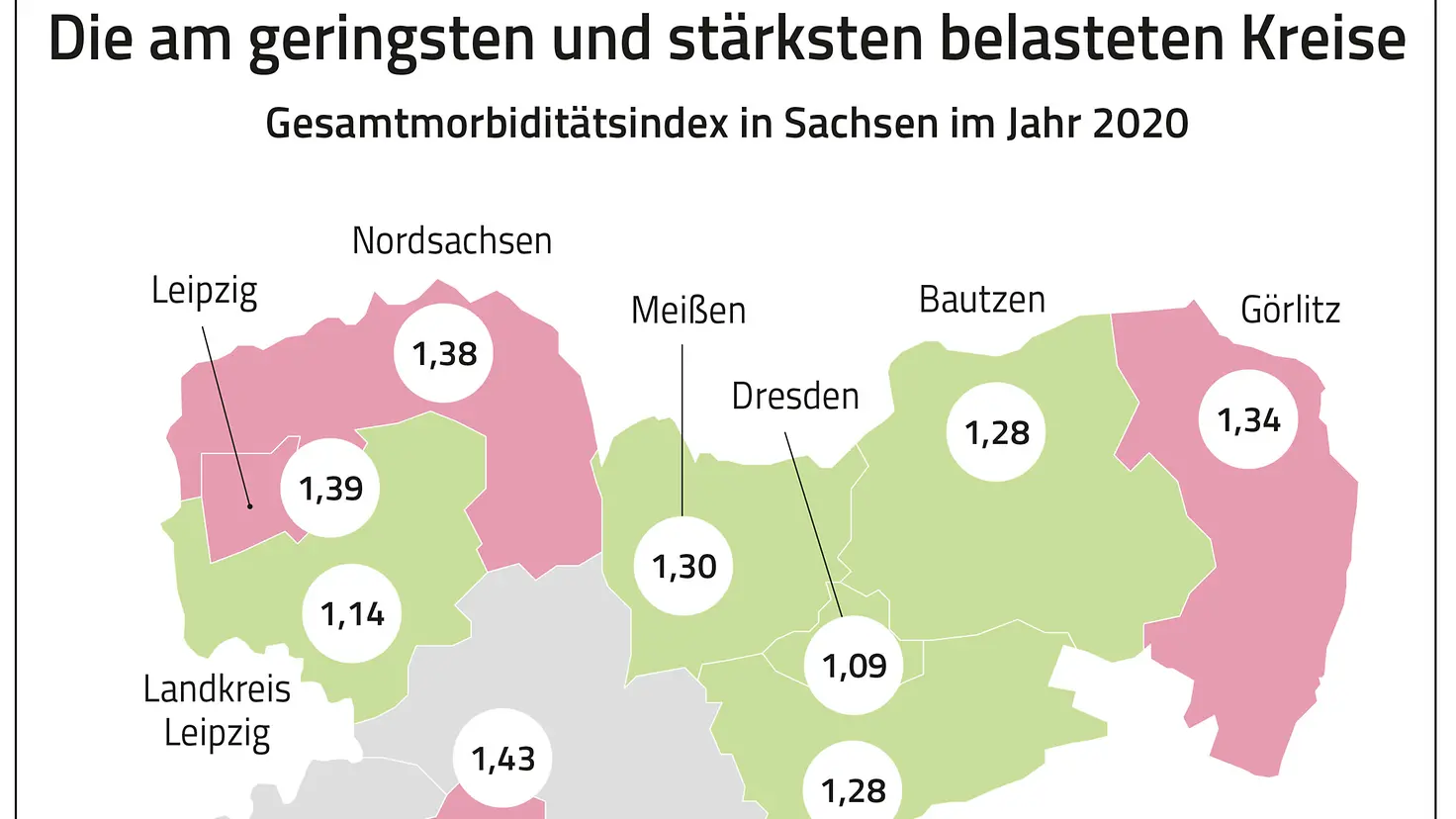 Dresden, 21. November 2022 – Die Menschen in Sachsen haben nach denen in Thüringen die höchste Krankheitslast in Deutschland. Sie liegt 28 Prozent über dem Bundesschnitt. Am schlechtesten schneiden dabei Chemnitz und die Stadt Leipzig ab, die 143 beziehungsweise 139 Prozent der durchschnittlichen Krankheitslast tragen. Die geringste Gesamtbelastung liegt in Dresden mit 109 Prozent vor. Das geht aus dem Morbiditäts- und Sozialatlas des BARMER Instituts für Gesundheitssystemforschung hervor. Der Atlas zeigt auf der Basis anonymisierter und standardisierter Versichertendaten, wie stark die Bevölkerung in Sachsen von Krankheit betroffen ist. „Der Morbiditäts- und Sozialatlas bietet ein realistisches Bild zur gesundheitlichen Situation der Menschen in Sachsen. Er ermöglicht darüber hinaus detaillierte Aussagen zu wichtigen Krankheiten, zeigt regionale Unterschiede und stellt den Einfluss von Geschlecht, Alter, Einkommen, Bildung und Branche auf die Krankheitslast dar. Interaktive Grafiken erleichtern den Zugang dabei enorm“, sagt Fabian Magerl, Landesgeschäftsführer der BARMER in Sachsen.