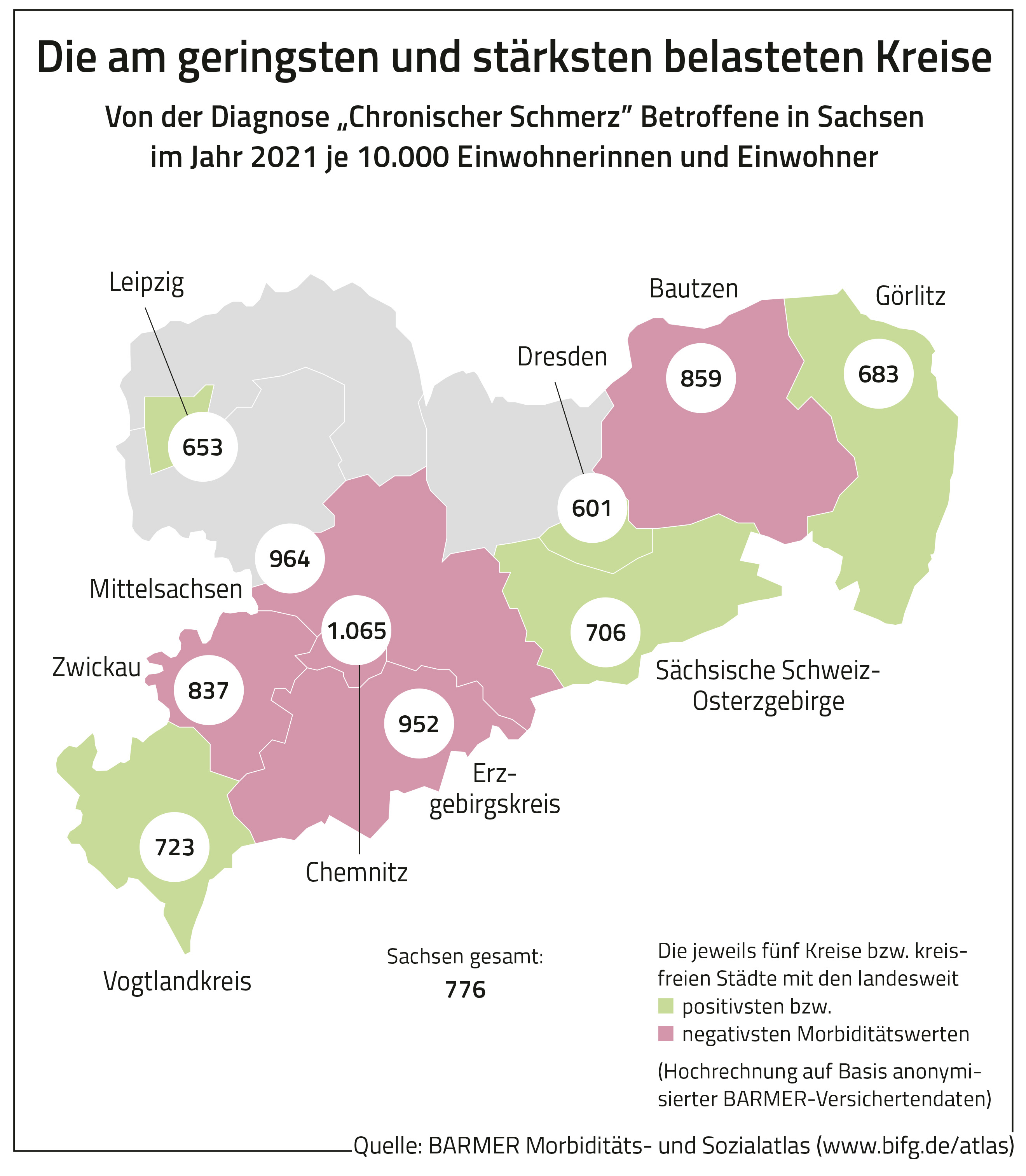 Dresden, 05. Januar 2024 – Sachsen hat nach Thüringen die höchste Rate an chronischen Schmerzpatientinnen und -patienten in Deutschland. Das geht aus dem Schmerz-Atlas des Barmer Instituts für Gesundheitssystemforschung (bifg) hervor, der Abrechnungsdaten aus dem Jahr 2021 analysiert hat. 776 je 10.000 Einwohnerinnen und Einwohner leiden in Sachsen demnach länger als sechs Monate an Schmerzen. Dieser Wert liegt um 36 Prozent über dem Bundesschnitt von 571 je 10.000 Einwohner. Am geringsten ist die Rate in Dresden und am höchsten in Chemnitz, mit 601 beziehungsweise 1.065 je 10.000 Einwohner.