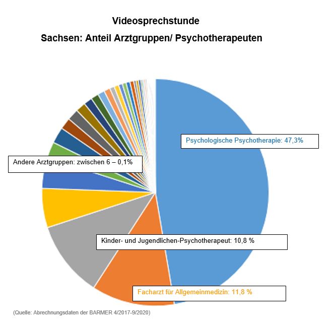 Dresden, 27. Mai 2021 – In Sachsen bieten immer mehr Arzt- und psychotherapeutische Praxen Videosprechstunden an. „Diese telemedizinische Versorgung ist eine zukunftsweisende Möglichkeit, um in Zeiten hoher Infektionszahlen, beispielsweise während Pandemien oder Grippewellen einem steigenden Therapiebedarf gerecht zu werden und gleichzeitig Infektionsrisiken durch physischen Kontakt zu vermeiden“, sagt Dr. Fabian Magerl, Landeschef der Barmer in Sachsen. In den Jahren 2018 und 2019 rechneten lediglich zwei bis drei Praxen Videosprechstunden mit der Barmer ab. In den Behandlungsquartalen 2020 waren es hingegen bereits rund 500 Praxen, die eine derartigen Videosprechstunden angeboten haben. Die Tendenz ist steigend. Mit rund 47 Prozent wurden die meisten telemedizinischen Sprechstunden von der Fachgruppe der Psychotherapeuten durchgeführt, gefolgt von den Allgemeinmedizinerinnen und -mediziner mit rund 12 Prozent. Die Kinder- und Jugendtherapeutinnen und -therapeuten liegen in Sachsen mit rund 11 Prozent auf Platz 3.