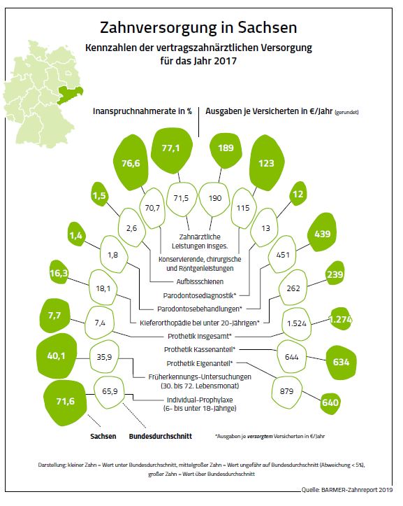 Von Kindesbeinen an ist den Sachsen die Vorsorge und Früherkennung von Zahnerkrankungen wichtig. Groß und Klein gehen regelmäßig zum Zahnarzt. Rund 70 Prozent der gesetzlich Versicherten im Freistaat erhielten von der Kasse für ihre vorbildliche Vorsorge den Höchstzuschuss bei der Versorgung mit Zahnersatz. Bundesweit waren es nur 51,4 Prozent.