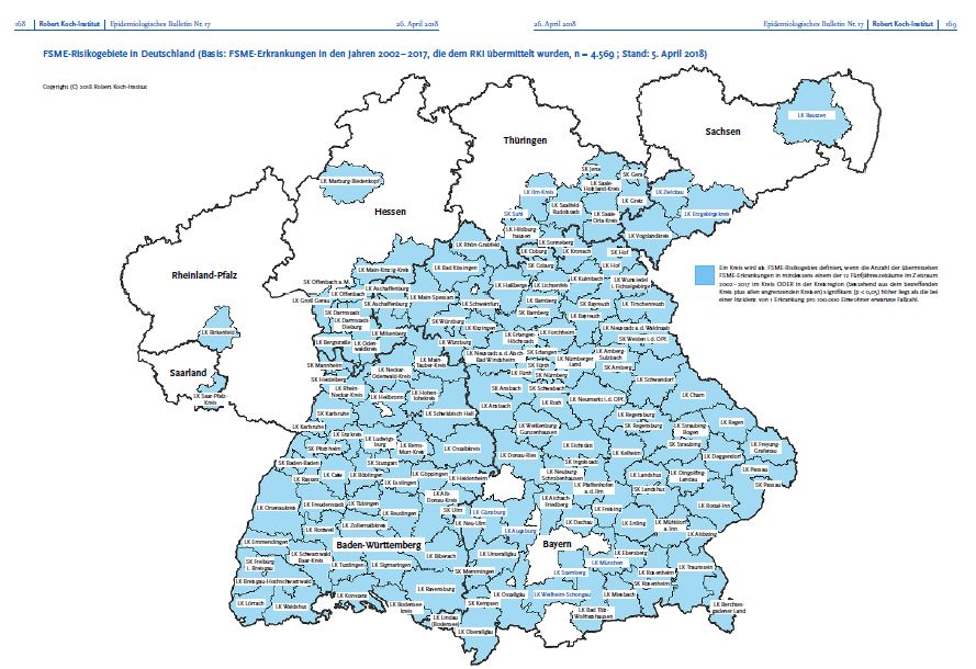 Deutschland gilt laut RKI als Infektionsland. 2017 wurden hier insgesamt 485 FSME-Erkrankungen erfasst, im Vorjahr waren es nur 348. Das entsprach einer Zunahme von 40 Prozent. Eine Steigerung der Impfquoten insbesondere in Kreisen mit hohen FSME-Infektionsrisiko könnte einen erheblichen Teil der Fälle verhindern. Mit steigenden Temperaturen erhöht sich auch die Gefahr für einen Zeckenstich, weil die Spinnentiere wieder aktiv werden. In Deutschland besteht vor allem in Bayern und Baden-Württemberg, in Südhessen, im südöstlichen Thüringen und nun auch in vier Kreisen in Sachsen ein Risiko, durch Zeckenstiche mit dem FSME-Virus infiziert zu werden. Auch in typischen Urlaubsländern unter anderem auch in Finnland, Schweden, Dänemark, Polen, Russland, Österreich, Tschechien, der Slowakei, Slowenien, Norditalien und Ungarn besteht ein hohes FSME-Risiko.