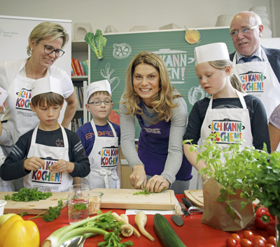 Staatsministerin Klepsch, Sarah Wiener, Paul-Friedrich Loose kochen mit Kindern aus der 54. Grundschule Leipzig