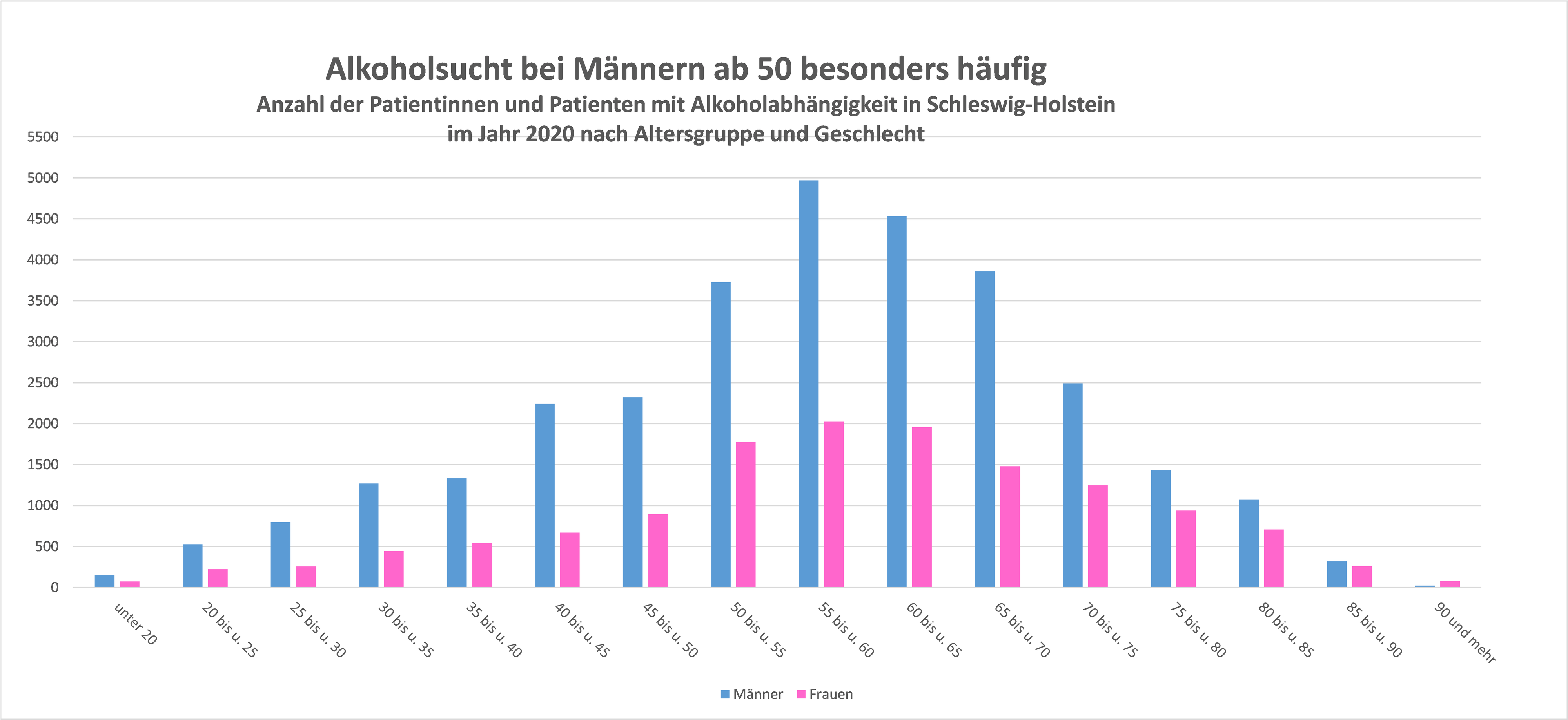 Wie aus der Barmer-Auswertung weiter hervorgeht, waren im vergangenen Jahr in Schleswig-Holstein 31.100 Männer und 13.600 Frauen erwiesenermaßen alkoholabhängig. Dabei sind vor allem Menschen in der zweiten Lebenshälfte betroffen gewesen. So waren unter den 55- bis 60-jährigen Männern zuletzt knapp 5.000 alkoholabhängig und etwas mehr als 2.000 Frauen in derselben Altersgruppe. „Alkoholismus manifestiert sich in der Regel über viele Jahre und kommt vor allem in der Generation der Babyboomer der 50er- und 60er-Jahre vor. Neben individuellen Gründen und Schicksalsschlägen mag auch die Sozialisation eine Rolle spielen. Alkohol hatte damals einen anderen Stellenwert, insbesondere in Zeiten des Wirtschaftswunders. Heute stehen in der Gesellschaft die Risiken viel stärker im Vordergrund“, sagt Hillebrandt. Gleichwohl sei die Zahl der Menschen mit der Diagnose Alkoholabhängigkeit in Schleswig-Holstein in den vergangenen fünf Jahren von 42.749 auf 44.701 Betroffene gestiegen, wobei es vom Jahr 2019 auf 2020 einen minimalen Rückgang gegeben habe. Dieser lasse sich mutmaßlich auf die Corona-Pandemie zurückführen und die Tatsache, dass weniger Menschen ärztliche Hilfe in Anspruch genommen hätten. Dadurch seien einige Fälle auch unentdeckt geblieben.