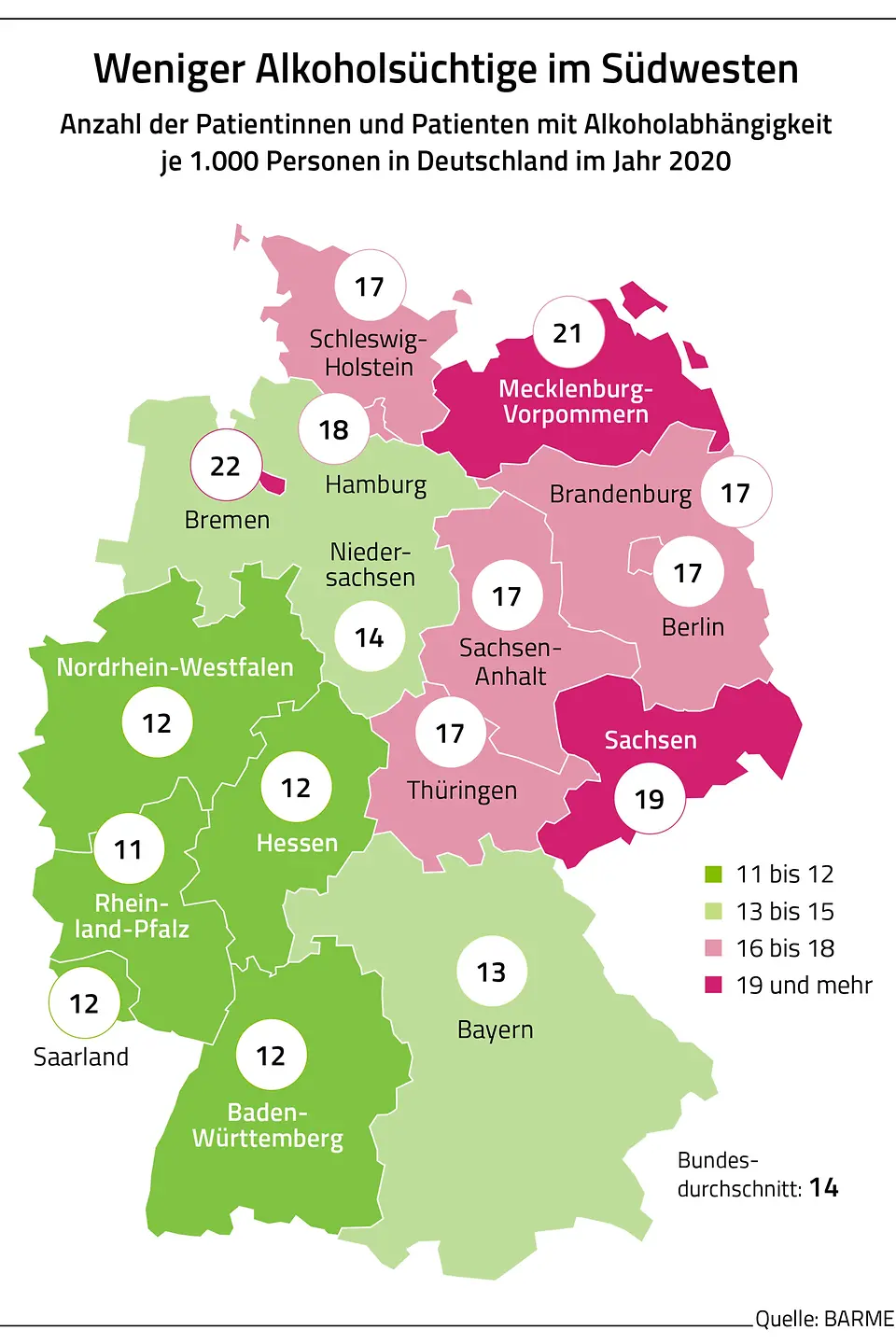 Kiel, 28. Dezember 2021 – In Schleswig-Holstein gibt es 19 Prozent mehr alkoholkranke Menschen als im Bundesschnitt. Das geht aus einer Auswertung des Barmer Instituts für Gesundheitssystemforschung (bifg) hervor. Demnach diagnostizierten Ärztinnen und Ärzte im vergangenen Jahr in Schleswig-Holstein bei 17 je 1.000 Personen eine Alkoholabhängigkeit. Der Bundesschnitt lag bei 14 je 1.000. Die geringsten Prävalenzen gab es in Rheinland-Pfalz mit 11 je 1.000 Personen, die höchsten in Bremen mit 22. „Die massiven regionalen Unterschiede bei der Alkoholabhängigkeit sind rein medizinisch nicht erklärbar. Hier dürften auch sozio-demographische Faktoren eine Rolle spielen“, sagt Dr. Bernd Hillebrandt, Landesgeschäftsführer der Barmer in Schleswig-Holstein.