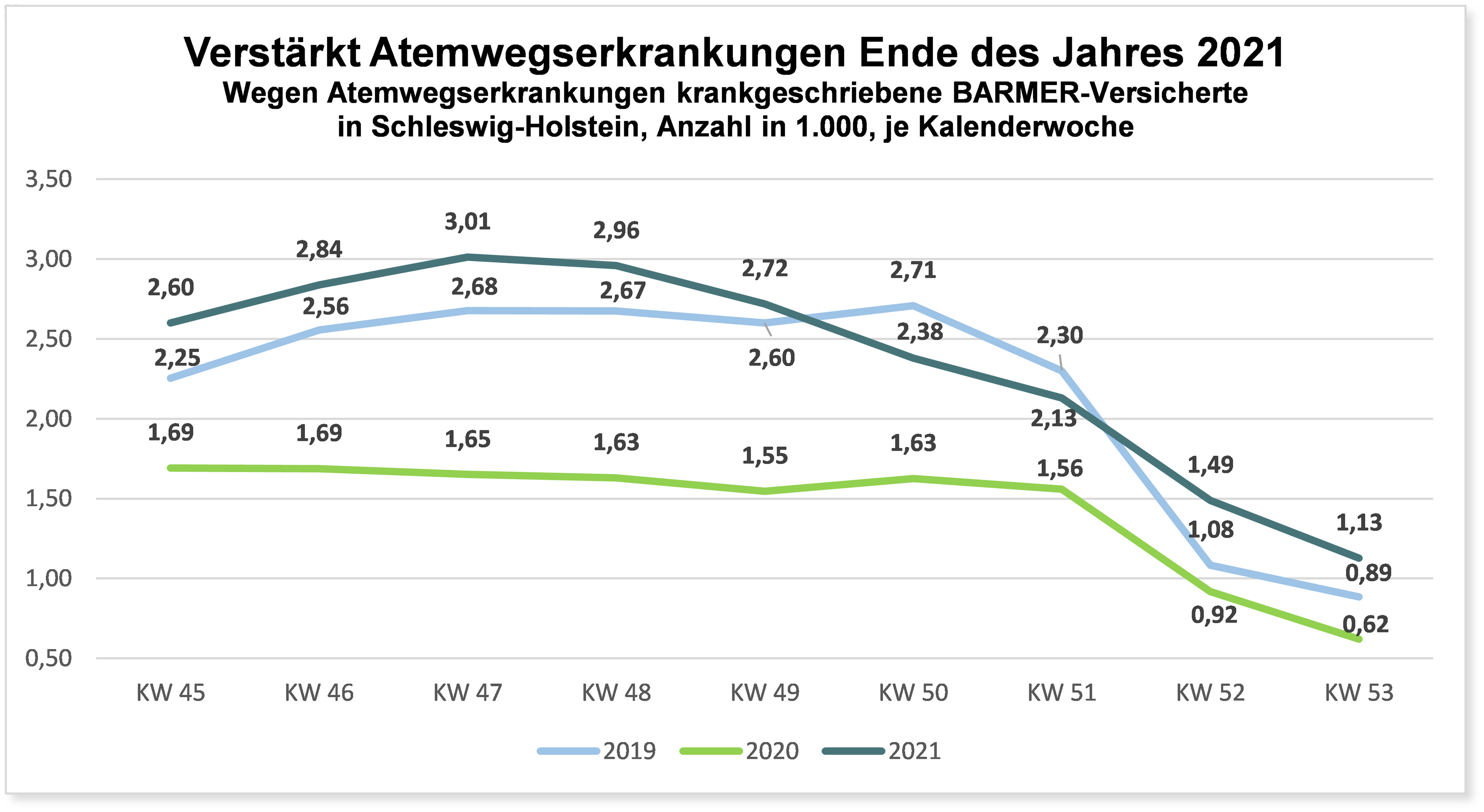 Kiel, 8. Februar 2022 – Atemwegsinfekte haben in den letzten beiden Monaten des Jahres 2021 zu besonders vielen Krankschreibungen geführt. Das geht aus einer Barmer-Analyse der Kalenderwochen (KW) 45 bis 53 über mehrere Jahre hervor. In der Spitze waren demnach in KW 47 des vergangenen Jahres (20. bis 27. November) gut 3.000 Barmer-Versicherte in Schleswig-Holstein wegen typischer saisonaler Atemwegsinfekte arbeitsunfähig. Laut der Analyse, in der keine Corona-, Grippe- oder Pneumonie-Fälle enthalten sind, entspricht dies 189 je 10.000 Krankengeld-Anspruchsberechtigten. In KW 47 des Jahres 2020 gab es dagegen rund 1.650 Betroffene und im Vergleichszeitraum des Jahres 2019, also wenige Monate vor Pandemiebeginn, rund 2.680 arbeitsunfähige Barmer-Versicherte. „Die Erkältungswelle war im vergangenen Winter vergleichsweise flach. Deshalb dürfte der Antikörperschutz bei vielen Menschen nun etwas geringer sein, wodurch Atemwegsinfekte leichter auftreten können“, sagt Dr. Bernd Hillebrandt, Landesgeschäftsführer der Barmer in Schleswig-Holstein. Auch in den letzten beiden Kalenderwochen des Jahres 2021 habe es mehr Atemwegsinfekte gegeben als in den Vorjahreszeiträumen. Hier sei die Zahl der Krankschreibungen wegen der Weihnachtsferien aber grundsätzlich geringer.