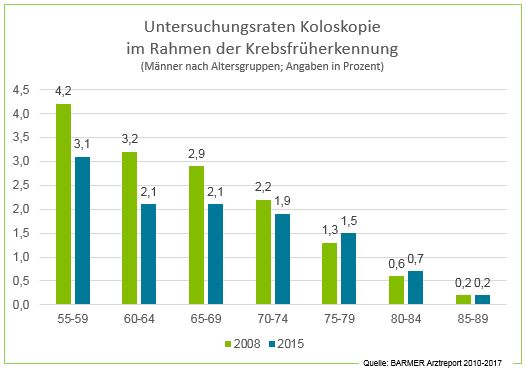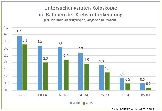 Kiel, 27. Juli 2017 - 15 Jahre nach Einführung der Darmspiegelung (Koloskopie) im Rahmen der Krebsfrüherkennung gehen die Untersuchungsraten merklich zurück. Dies belegen Auswertungen zur ärztlichen ambulanten Versorgung von Versicherten der Barmer. In den Jahren 2008 bis 2015 nahm die Inanspruchnahmerate bei beiden Geschlechtern und in allen Altersgruppen ab 55 Jahre deutlich ab. Der höchste Rückgang war bei Frauen im Alter von 60 bis 64 Jahren festzustellen. Hier ging die Rate von 3,2 Prozent teilnehmender Frauen im Jahr 2008 auf 2,0 Prozent im Jahr 2015 zurück.