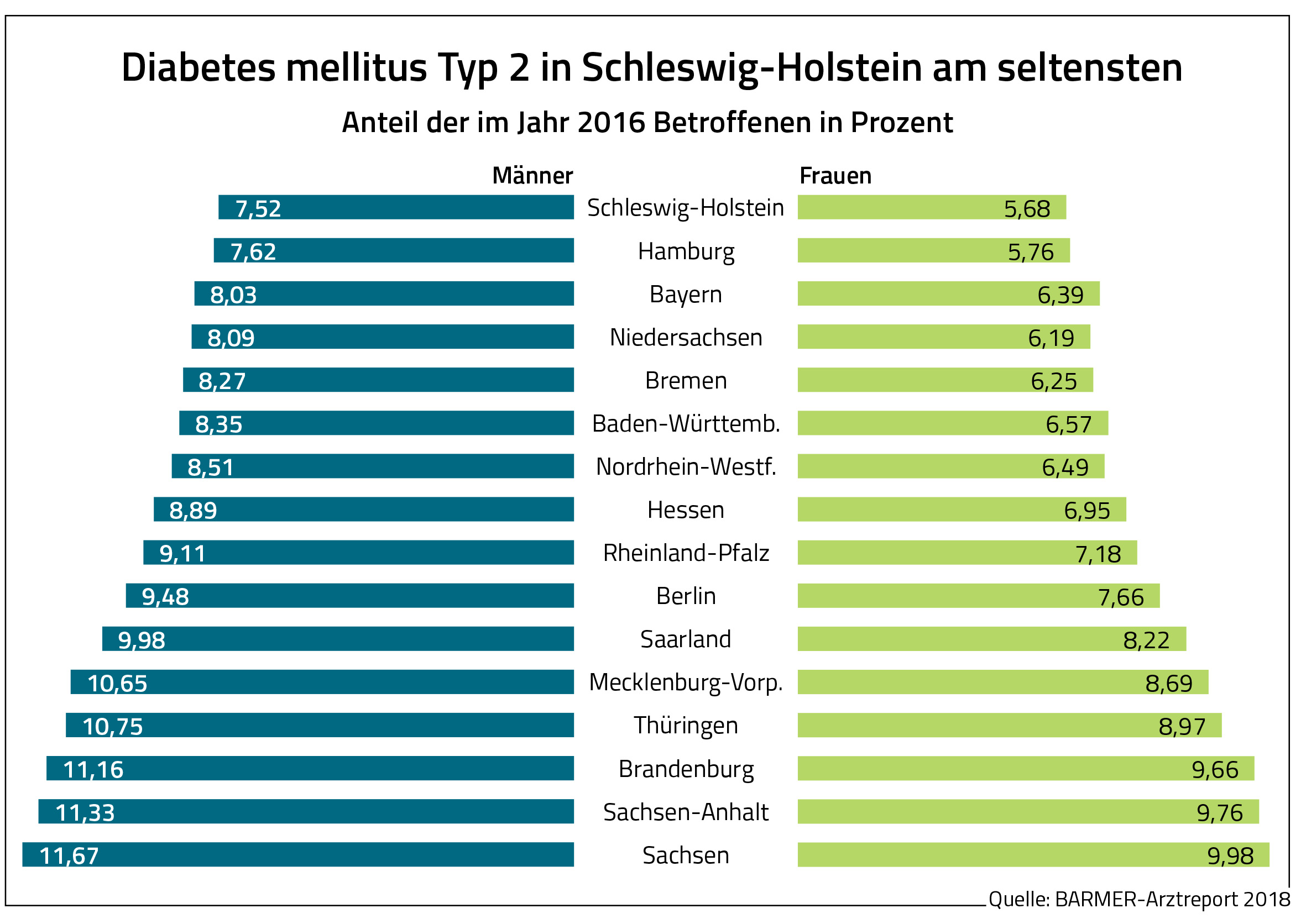 Kiel, 01. August 2018 – Die Schleswig-Holsteiner sind seltener von Diabetes mellitus Typ 2 betroffen als die Menschen in anderen Bundesländern. Im Jahr 2016 lag die Diagnoserate der Männer bei 7,52 Prozent und der Frauen bei 5,68 Prozent. Betroffen sind demnach in Schleswig-Holstein rund 106.000 Männer und 84.000 Frauen. Dies zeigen Auswertungen der Barmer von Diagnosedaten der ärztlichen ambulanten Versorgung, die von den Ärzten im Rahmen der abgerechneten Behandlungen dokumentiert wurden. Die Diagnoseraten betrugen 2016 im Bundesdurchschnitt bei Männern 8,98 Prozent und bei Frauen 7,15 Prozent. Die höchsten Diagnoseraten wurden bei Männern und Frauen in Sachsen (11,67 Prozent/9,98 Prozent) festgestellt.
