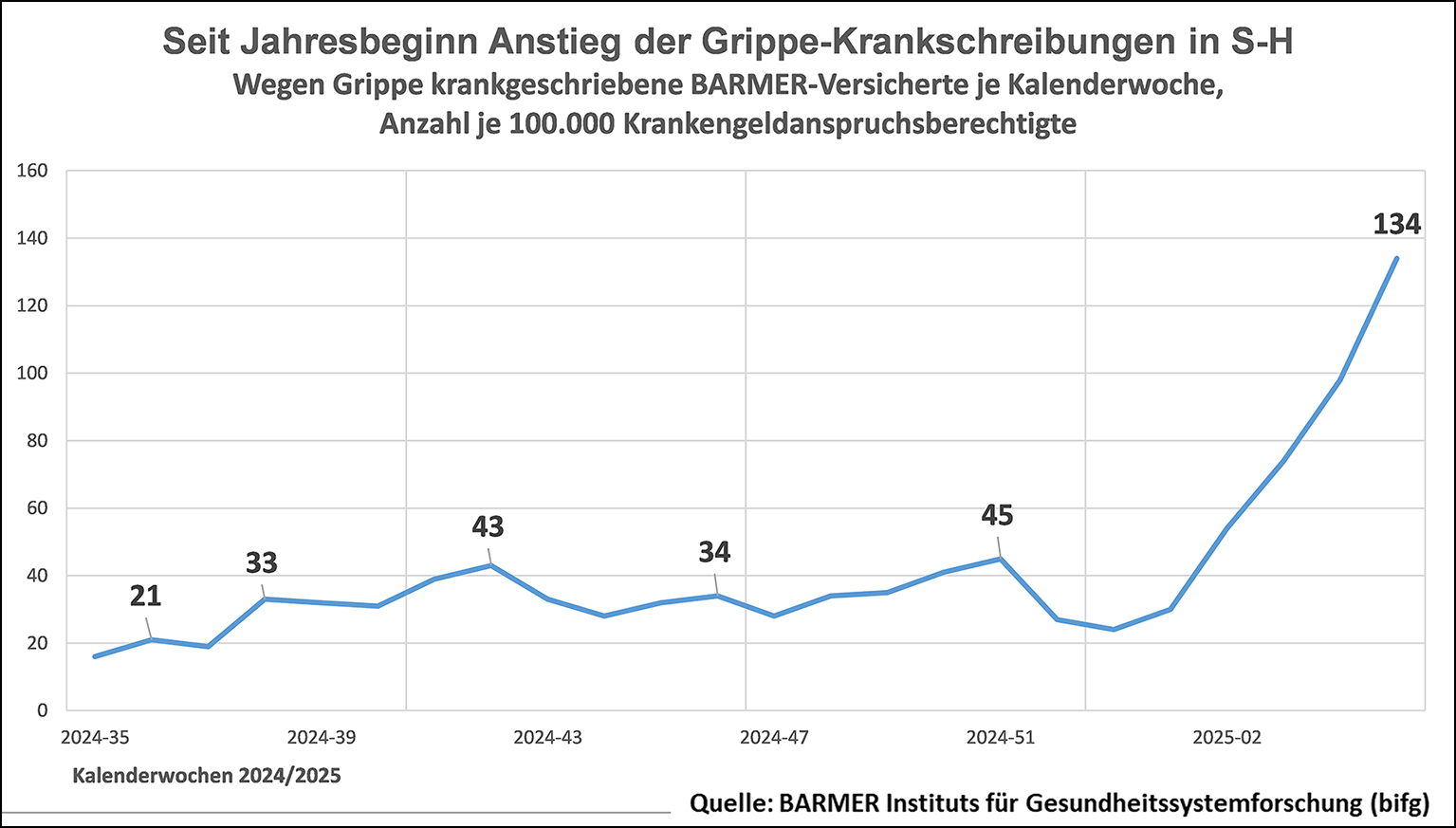 Kiel, 21. Februar 2025 – Die Krankschreibungen aufgrund von Grippe sind in Schleswig-Holstein seit Mitte Dezember 2024 deutlich angestiegen. In der Kalenderwoche 51 des Vorjahres (16. bis 22. Dezember) waren 45 von 100.000 Barmer-Versicherten, die Anspruch auf Krankengeld haben, aufgrund von Grippe arbeitsunfähig. In der Kalenderwoche fünf des Jahres 2025 (27. Januar bis 2. Februar) stieg diese Zahl bereits auf 134 je 100.000 Versicherte an – ein Anstieg um fast 200 Prozent. Diese Daten stammen aus aktuellen Erhebungen des Barmer Instituts für Gesundheitssystemforschung (bifg). „Unsere Daten zeigen derzeit eine der höchsten Grippe-Krankschreibungsraten der letzten fünf Jahre in Schleswig-Holstein. Nur in der 51. Kalenderwoche 2022 lag die Rate mit 138 Grippe-Erkrankten pro 100.000 Versicherte etwas höher“, sagt Dr. Bernd Hillebrandt, Landesgeschäftsführer der BARMER in Schleswig-Holstein.