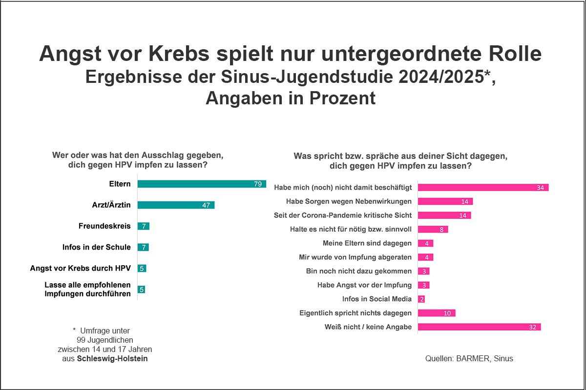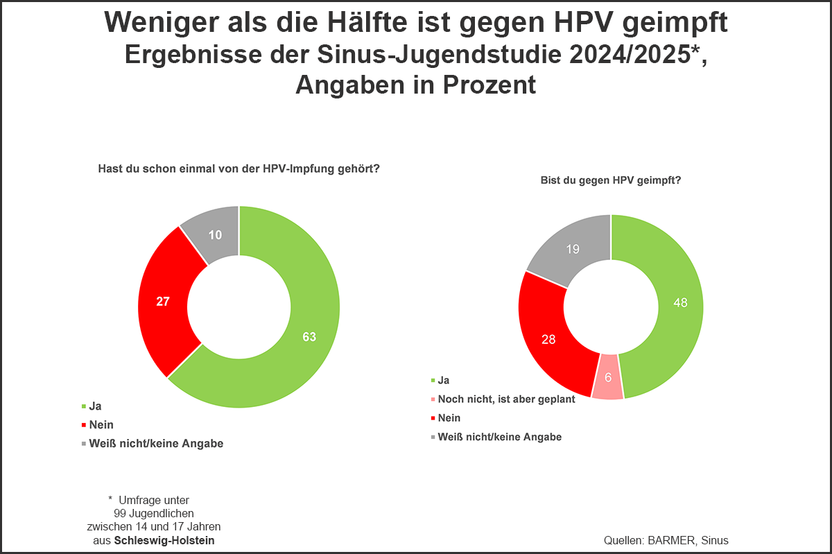 Kiel, 28. August 2025 – Weniger als die Hälfte der 14- bis 17-Jährigen ist gegen das humane Papillomavirus (HPV) geimpft, den Hauptverursacher von Gebärmutterhalskrebs. Dies zeigt die repräsentative Sinus-Jugendstudie 2024/2025 im Auftrag der Barmer, die im Herbst 2024 bundesweit 2.000 Jugendliche befragte, darunter 99 aus Schleswig-Holstein. Dort erhielten nur 48 Prozent mindestens eine HPV-Impfung. Bei weiteren sechs Prozent war die Immunisierung geplant. 55 Prozent der Mädchen und 42 Prozent der Jungen waren zumindest einmal geimpft. „Noch immer sind zu wenige junge Menschen gegen HPV geimpft. Dabei kann die Impfung Krebs verhindern und Leben retten. HPV verursacht die Hälfte aller virusbedingten bösartigen Tumore und fast alle Fälle von Gebärmutterhalskrebs“, sagt Dr. Bernd Hillebrandt, Landesgeschäftsführer der Barmer in Schleswig-Holstein. Die Ständige Impfkommission am Robert Koch-Institut empfehle die HPV-Impfung für Mädchen und Jungen zwischen neun und 14 Jahren.