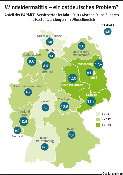 Allein bei der Barmer waren bundesweit durchschnittlich 9,5 Prozent der Mädchen und Jungen in dieser Altersgruppe betroffen. Die geringsten Betroffenenraten gab es in Hamburg mit 6,5 und Schleswig-Holstein mit 7,8 Prozent. In Brandenburg war der Anteil der Kinder mit Windeldermatitis am höchsten (12,4 Prozent).