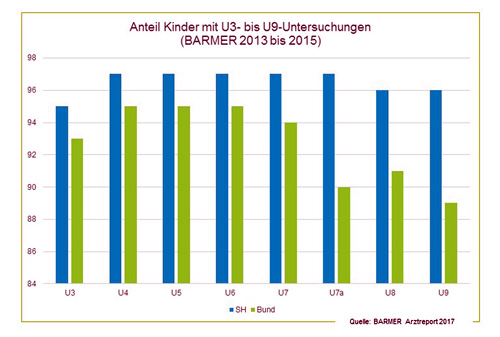 Kiel, 13. Juni 2017 - In Schleswig-Holstein nehmen so viele Kinder an den Früherkennungsuntersuchungen teil wie in keinem anderen Bundesland. Wie Auswertungen der Barmer zeigen, weist Schleswig-Holstein bei den Untersuchungen U3 bis U9 die höchsten Teilnahmeraten auf. Nur bei drei von 100 der bei der Barmer versicherten Kinder wurde von den Ärzten in den Jahren 2013 bis 2015 keine der Untersuchungen U4 bis U7a abgerechnet, bei den Untersuchungen U8 und U9 bei vier von 100 Kindern. Im Durchschnitt aller Bundesländer nahmen an den U4 bis U7 fünf bis sechs und an den U7a bis U9 zehn bis elf Kinder nicht an den Untersuchungen teil.