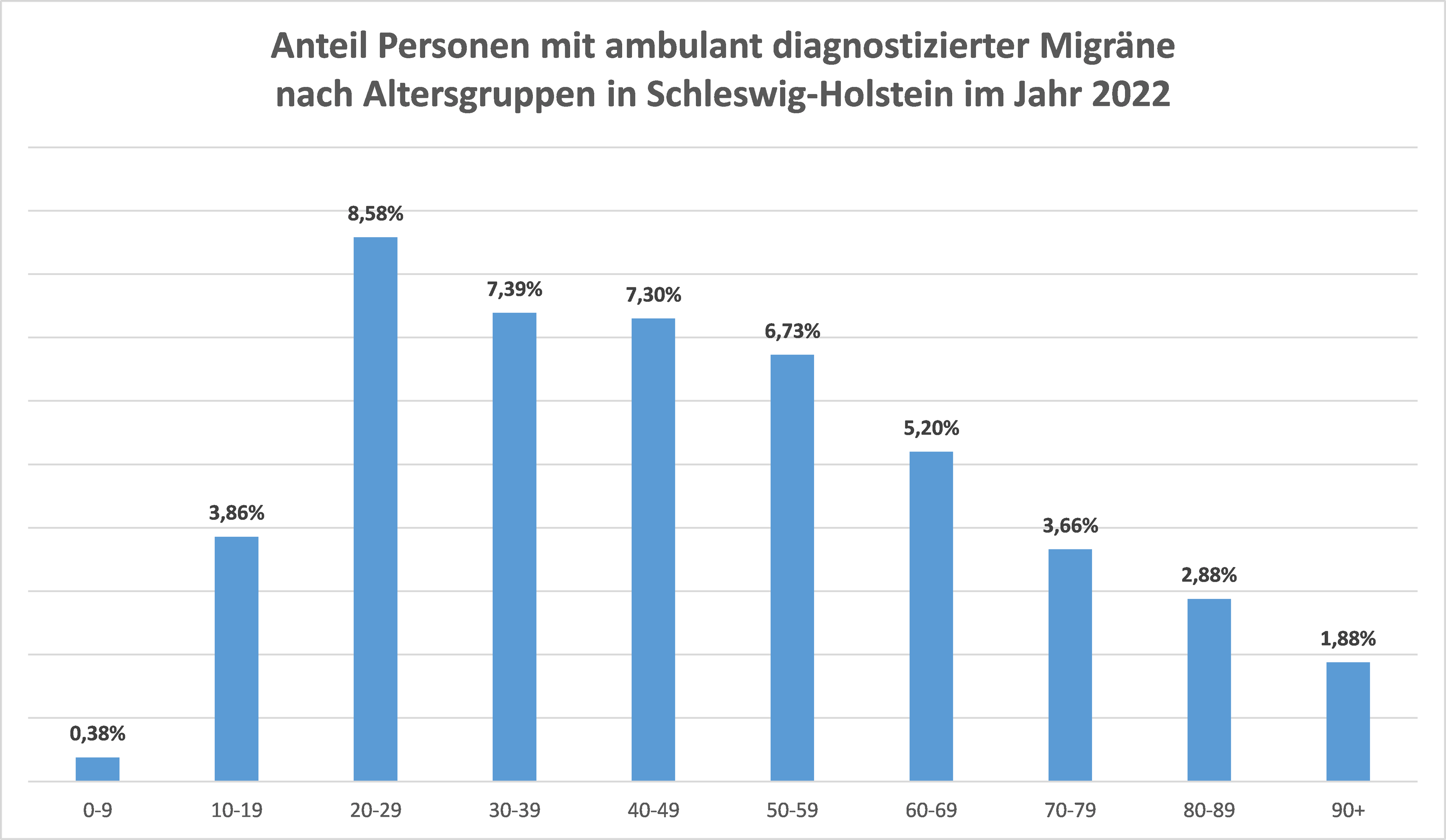 Kiel, 4. Oktober 2023 – In Schleswig-Holstein leiden immer mehr Menschen unter Migräne. Das zeigen Daten der Barmer. Migräne ist die häufigste Kopfschmerzform, rund 160.000 Menschen in Schleswig-Holstein waren im Jahr 2022 mit dieser Diagnose in ärztlicher Behandlung. Das entspricht 5,4 Prozent der Bevölkerung. In den letzten Jahren ist die Zahl der Betroffenen stetig angestiegen: Im Jahr 2012 lag ihr Anteil noch bei 4,0 Prozent. Insgesamt sind Frauen in nördlichsten Bundesland mit rund acht Prozent fast dreimal häufiger von Migräne betroffen als Männer, von denen 2,8 Prozent im Jahr 2022 mit Migräne behandelt wurden. „Auffällig ist, dass Migräne bei jungen Leuten besonders häufig auftritt. In der Gruppe der 20- bis 29-Jährigen ist jede achte Frau betroffen“, sagt Dr. Bernd Hillebrandt, Landesgeschäftsführer der Barmer in Schleswig-Holstein.
