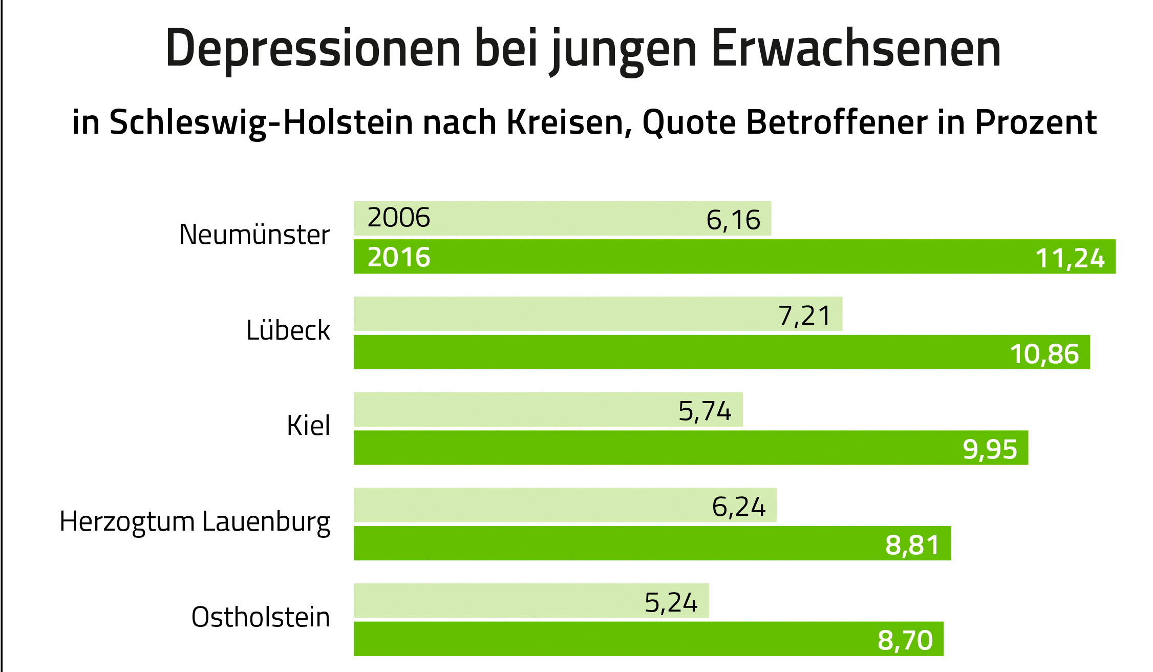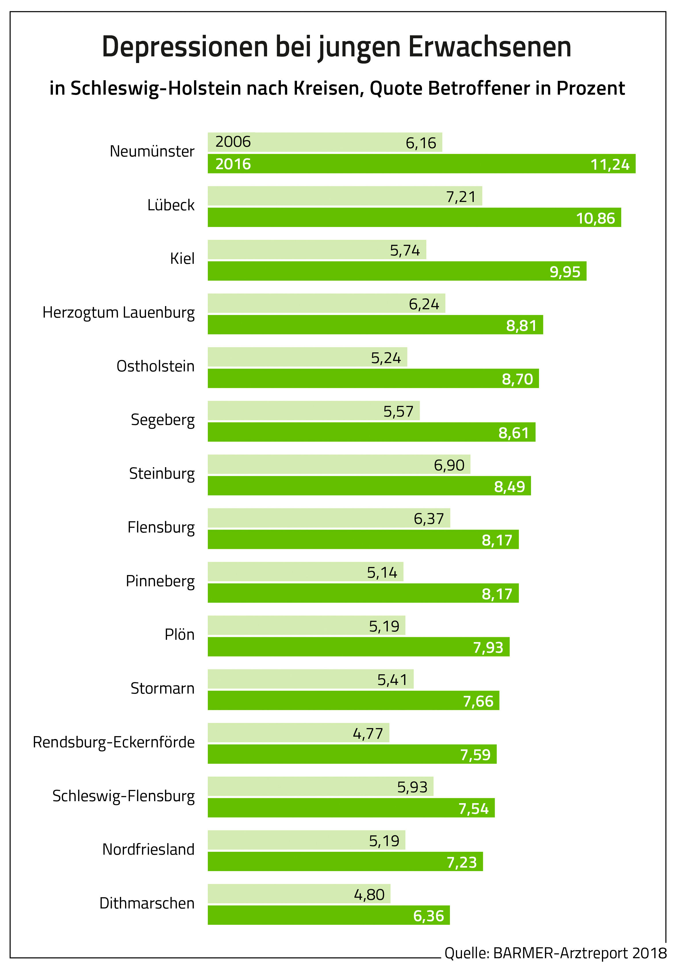 Die Barmer hat auch analysiert, wie viele junge Erwachsene in den schleswig-holsteinischen Städten und Landkreisen von einer Depression betroffen sind. Danach ist die Diagnoserate in allen Kreisen innerhalb von zehn Jahren deutlich gestiegen. In Neumünster wurde im Jahr 2016 bei 11,2 Prozent der 18- bis 25-Jährigen eine Depression ärztlich dokumentiert, zehn Jahre zuvor lag die Diagnoserate bei 6,2 Prozent. Auch in Lübeck lag die Diagnoserate 2016 mit 10,9 Prozent (2006 = 7,2 Prozent) hoch. Der Landkreis Dithmarschen weist im Land die niedrigste Betroffenenquote, aber ebenfalls einen Anstieg aus: von 4,8 Prozent im Jahr 2006 auf 6,4 Prozent im Jahr 2016.