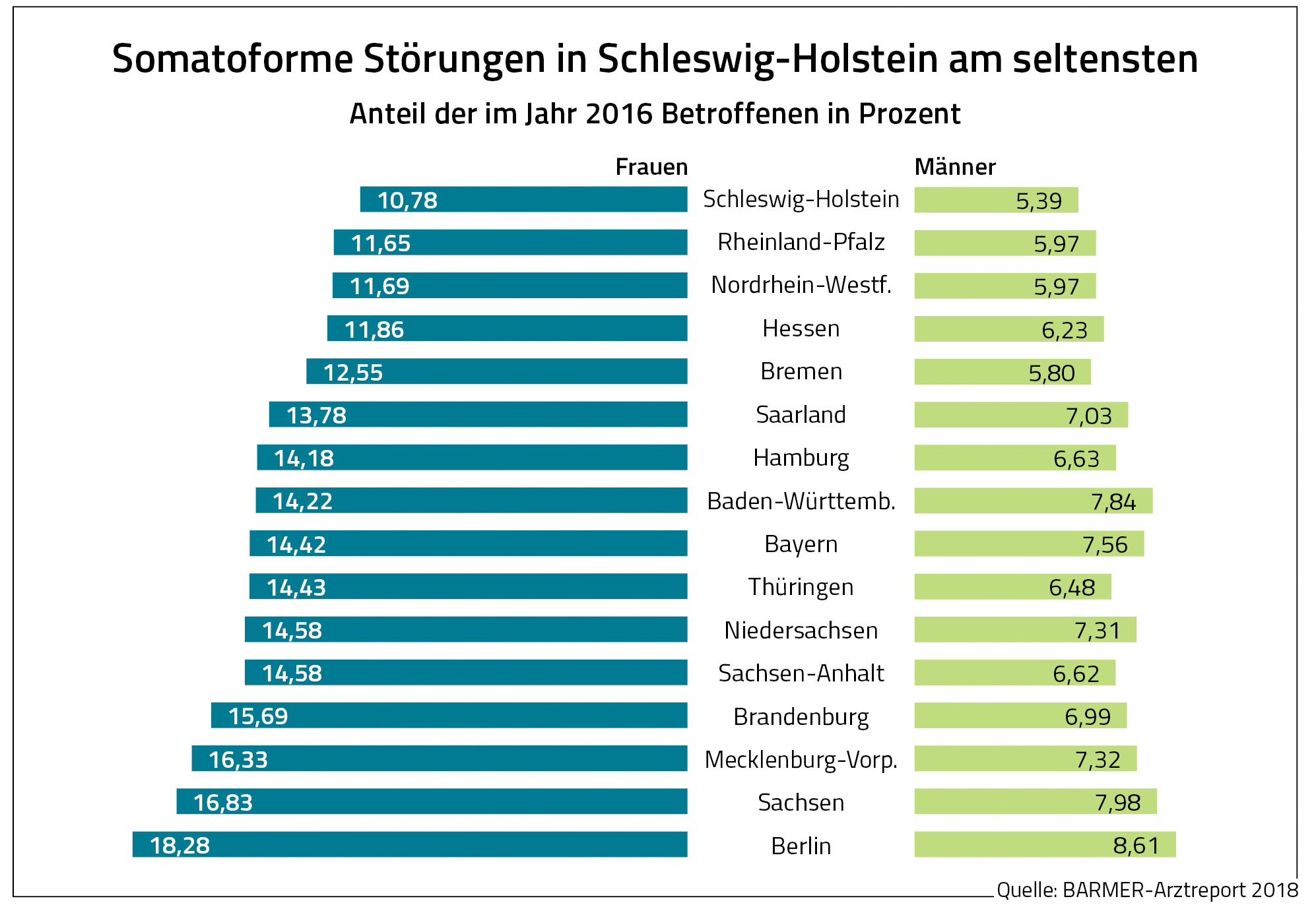 Kiel, 09. August 2018 – Nirgends sind somatoforme Störungen seltener als in Schleswig-Holstein. Unter Beschwerden, für die keine körperliche Ursache festgestellt werden konnte, leiden zwar jede 9. Schleswig-Holsteinerin (10,8 Prozent) und jeder 19. Schleswig-Holsteiner (5,4 Prozent). Dies sind jedoch 20 Prozent weniger als im Bundesdurchschnitt, wo die Diagnoseraten bei 13,6 Prozent (Frauen) und 6,8 Prozent (Männer) liegen. In Berlin, wo die Auswertungen der Barmer die höchsten Diagnoseraten zeigen, ist jede 5. Frau und jeder 12. Mann von dieser Form einer psychischen Erkrankung betroffen.