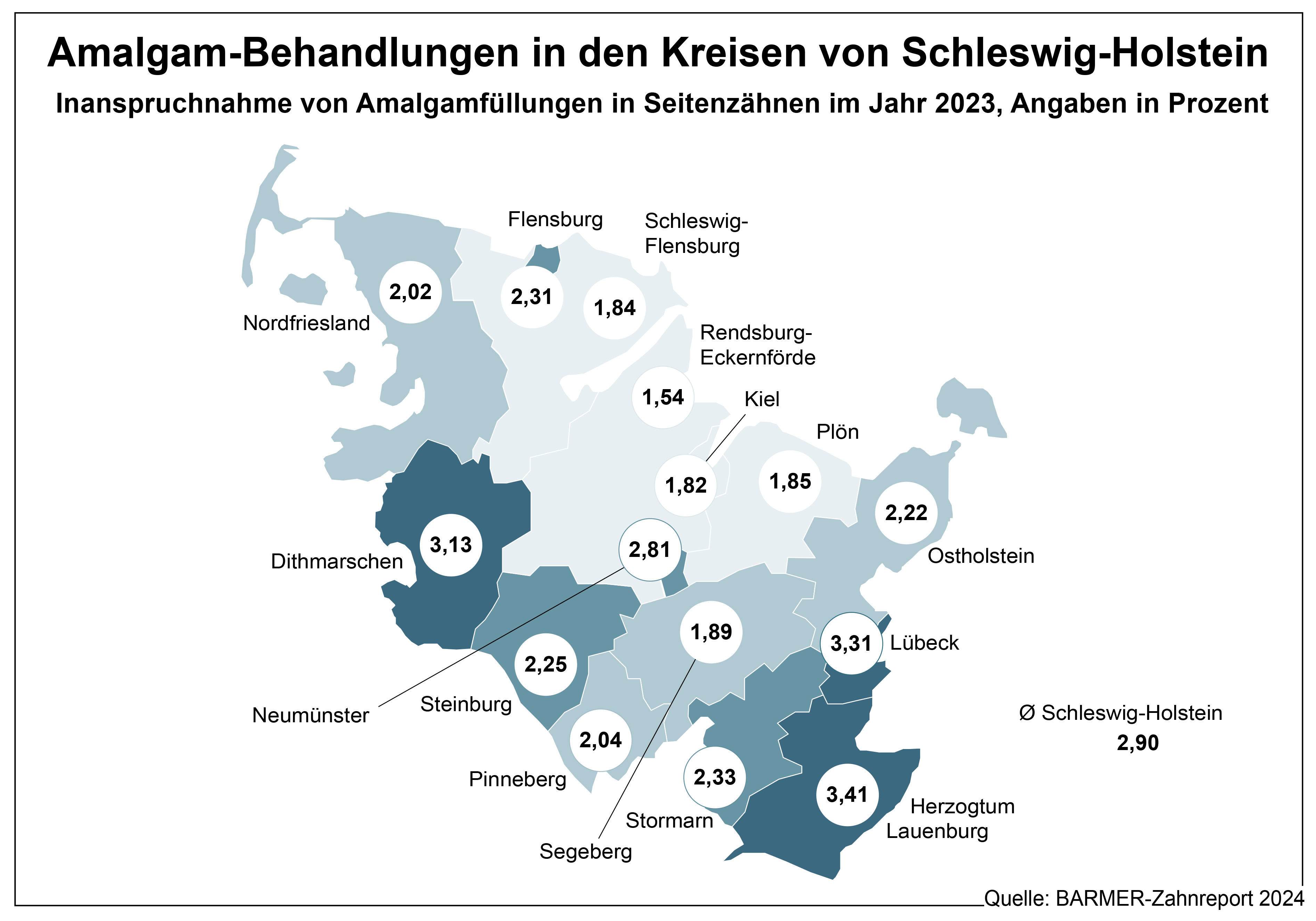 Die Haltbarkeit von Zahnfüllungen hat sich verbessert. Eine Barmer-Studie zeigt, dass bundesweit die Hälfte der großen Seitenzahnfüllungen aus 2010 mindestens 6,5 Jahre hielt, 2015 waren es bereits mindestens 7,2 Jahre. In Schleswig-Holstein sind 39,1 Prozent der Füllungen nach zehn Jahren noch intakt, in Baden-Württemberg sogar 42,3 Prozent, in Sachsen-Anhalt dagegen nur 18,5 Prozent. „Regionale Unterschiede bei der Haltbarkeit lassen sich zu 42 Prozent auf soziale Unterschiede bei Einkommen, Bildung und Beschäftigung zurückführen“, erklärt Hillebrandt. Bezahlbare, hochwertige Füllungstherapien und Aufklärungsmaßnahmen zur Zahngesundheit seien auch in Schleswig-Holstein weiterhin von großer Bedeutung.