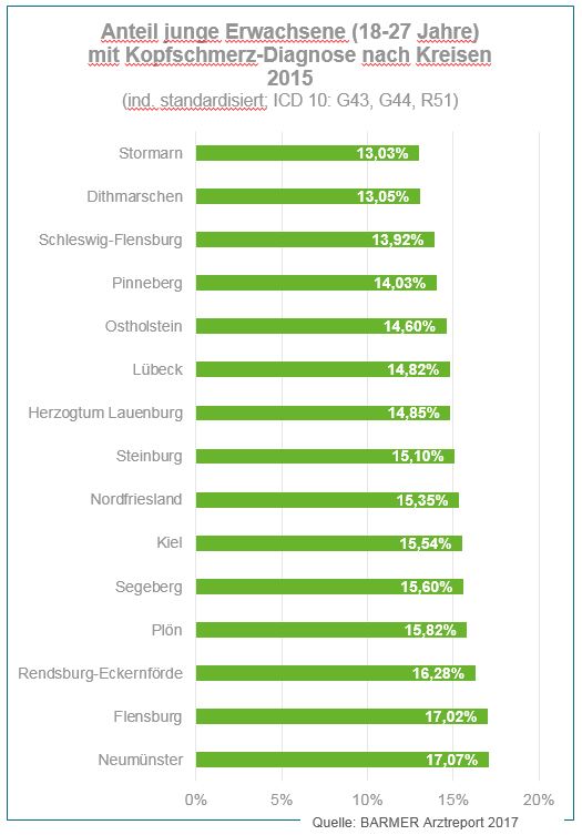 Der Anteil junger Erwachsener mit einer Kopfschmerz-Diagnose in der Altersgruppe von 18 bis 27 Jahren ist auch in Schleswig-Holsteins Städten und Kreisen unterschiedlich hoch. Die meisten Betroffenen gibt es in Neumünster (17,1 Prozent) und Flensburg (17,0 Prozent). Deutlich weniger junge Erwachsene mit einer ärztlich dokumentierten Kopfschmerz-Diagnose gibt es in Stormarn (13,0 Prozent) und Dithmarschen (13,1 Prozent).