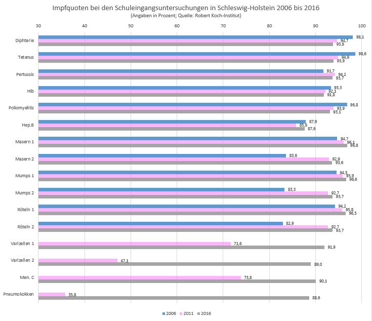 In allen Bundesländern werden regelmäßig Daten zum Impfstatus der Schulanfänger erhoben. Die rechtliche Grundlage dafür bietet das Infektionsschutzgesetz. Das Robert Koch-Institut (RKI), an das die Meldungen aus allen Bundesländern übermittelt werden, hat jetzt die Impfquoten für 2016 veröffentlicht. Verglichen mit Daten aus früheren Jahren zeigt sich für Schleswig-Holstein ein uneinheitliches Bild. Einzige nahezu Konstante: Für rund 91 Prozent der Kinder wurde bei den Schuleingangsuntersuchungen der Impfausweis vorgelegt.