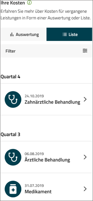 Die Kostenübersicht in der Barmer-App zeigt den Versicherten alle Leistungen, die Leistungserbringer wie z. B. Ärzte, Sanitätshäuser oder Krankenhäuser erbracht haben. Ein einzelner Eintrag listet die Kosten auf, die ein Arzt für eine Behandlung bei uns abgerechnet hat. In der Auswertungssicht können die Versicherten ihre Daten analysieren und in der Listenansicht unterschiedliche Datensätze filtern und sortieren, z. B. nach Leistungsart, Leistungserbringer oder Zeitraum. Für die bessere Übersichtlichkeit sorgt auch die Zusammenfassung der einzelnen Rechnungsdatensätze. Statt beispielsweise für ein Hilfsmittel drei Datensätze anzuzeigen, werden alle Kosten für ein Hilfsmittel gebündelt angezeigt.