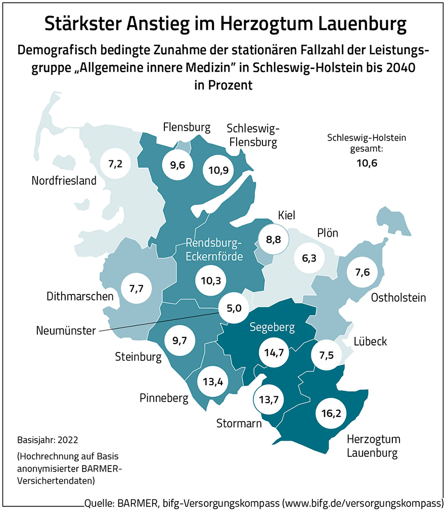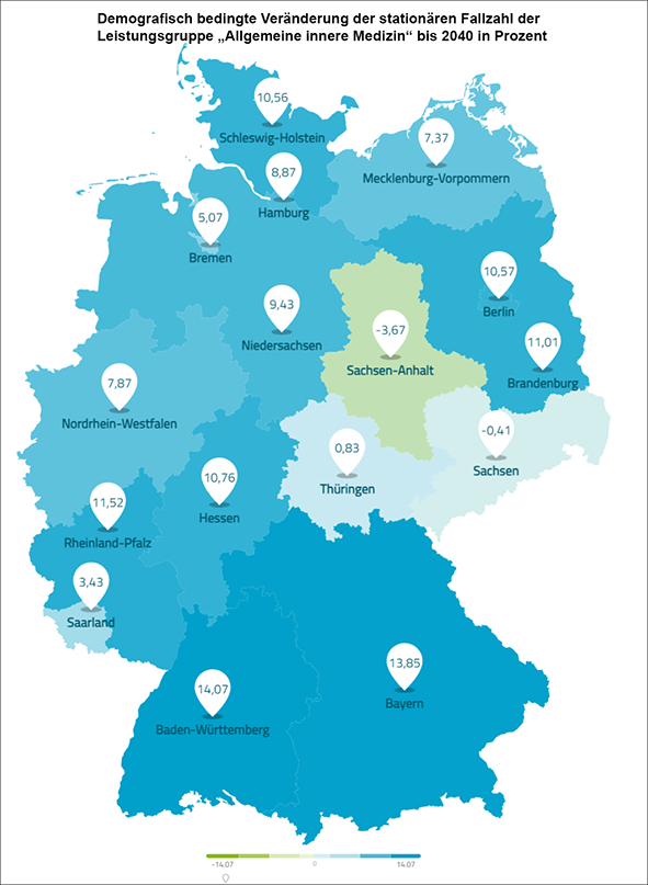 Aus der Prognose der stationären Fallzahlentwicklung bis in das Jahr 2040 geht weiterhin hervor, dass mit einer demografisch bedingten Erhöhung der stationären Fälle von durchschnittlich fünf Prozent zu rechnen ist. Auffällig ist dabei, dass sich die Fallzahlsteigerungen in den Bundesländern sehr stark unterscheiden: So steht im Bereich „Allgemeine innere Medizin“ den Ländern Baden-Württemberg (+14,1 Prozent) und Bayern (+13,9 Prozent) ein besonders hoher Anstieg bevor. Auch für Schleswig-Holstein wird ein zweistelliger Anstieg von +10,6 Prozent prognostiziert. Den stärksten Anstieg werde es mit +16,2 Prozent im Landkreis Herzogtum Lauenburg geben.