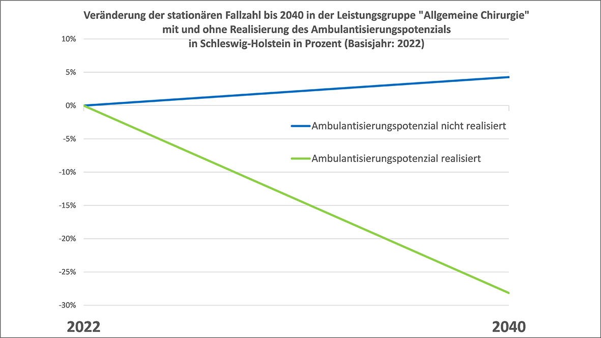 Das bifg sieht ein hohes Ambulantisierungspotenzial für eine Vielzahl von bislang stationär erbrachten Leistungen, dieses Potenzial müsse konsequent gehoben werden. Auf diese Weise könne dem demografisch bedingten Anstieg der stationären Fallzahlen entgegengewirkt und dieser sogar überkompensiert werden. Am Beispiel der Leistungsgruppe „Allgemeine Chirurgie“ legt das bifg dar, dass eine Entlastung des stationären Bereichs bundesweit von rund 30 Prozent möglich wäre. In Schleswig-Holstein liegt die Entlastung mit -28,16 Prozent im ähnlichen Bereich. Ganz anders sieht dies hingegen für die Geriatrie aus: Der bis 2040 prognostizierte Anstieg der Fallzahl kann durch Ambulantisierung nicht abgefedert werden.