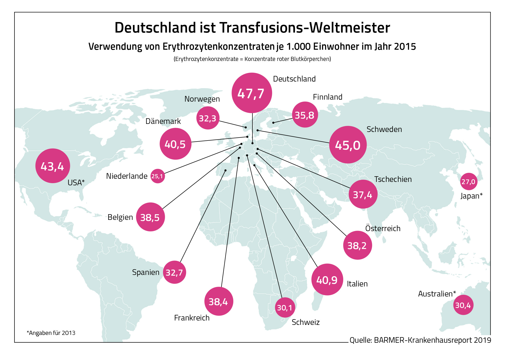 Allein im Jahr 2017 wurden 3,2 Millionen Blutkonserven eingesetzt. Laut Barmer Report wurden 2017 in Schleswig-Holstein rund 112.000 Bluttransfusionen aufgewendet, der Verbrauch lag bei 38,9 Einheiten je 1.000 Einwohner. Zum Vergleich: In den Niederlanden wurden 2017 insgesamt nur etwa 407.000 Blutkonserven eingesetzt. Dort lag der Verbrauch bei nur 23,8 Einheiten je 1.000 Einwohner.