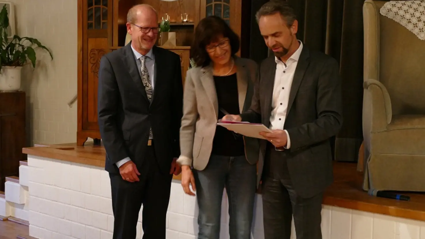 von links nach rechts: Volker Schümann (Vorsitzender Sozialstation im Amt Hürup), Maren Matthiesen (Stationsleiterin, Geschäftsführerin der Sozialstation) und Dominik Völk (Abteilungsleiter Gesundheit im Ministerium für Soziales, Gesundheit, Jugend, Familie und Senioren)