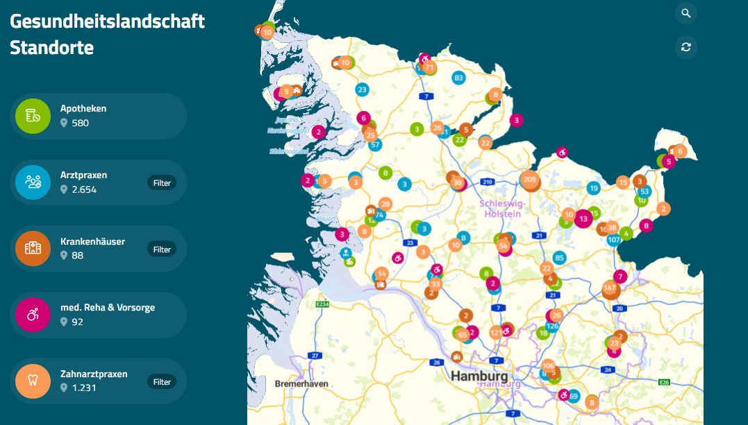 Die interaktive Karte zeigt die Gesundheits-Standorte in Schleswig-Holstein. 15 Zoomstufen bieten detaillierte Darstellungen bis zur Straße in der Nachbarschaft. Gesundheitsversorger lassen sich einzeln oder zusammengefasst darstellen. Filteroptionen erleichtern den Überblick über Facharztrichtungen, Bettenklassen und Fachbereiche eines Krankenhauses oder zahnmedizinische Fachrichtungen. Die Karte zeigt auch die Versorgungsdichte einer Region, also die Anzahl medizinischer Dienstleister im Verhältnis zur Einwohnerzahl.