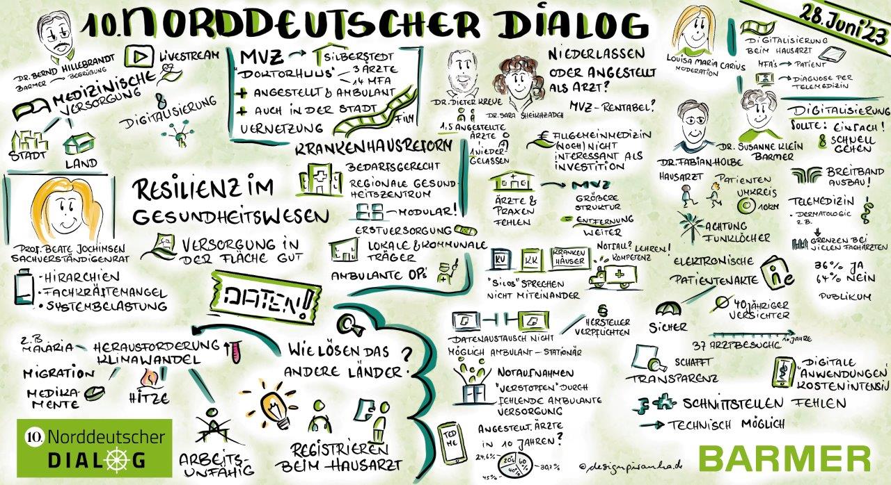 Die Diskussionsrunden wurden durch Filmbeiträge mit Best-Practice-Beispielen aus Norddeutschland flankiert. Zudem sorgte Susanne Speer von Designpiranha für einen besonderen Blickfang. Sie hielt die Veranstaltung grafisch als sogenannte ,Sketchnote‘ fest. Die Illustration kann am Ende des Artikels heruntergeladen werden.