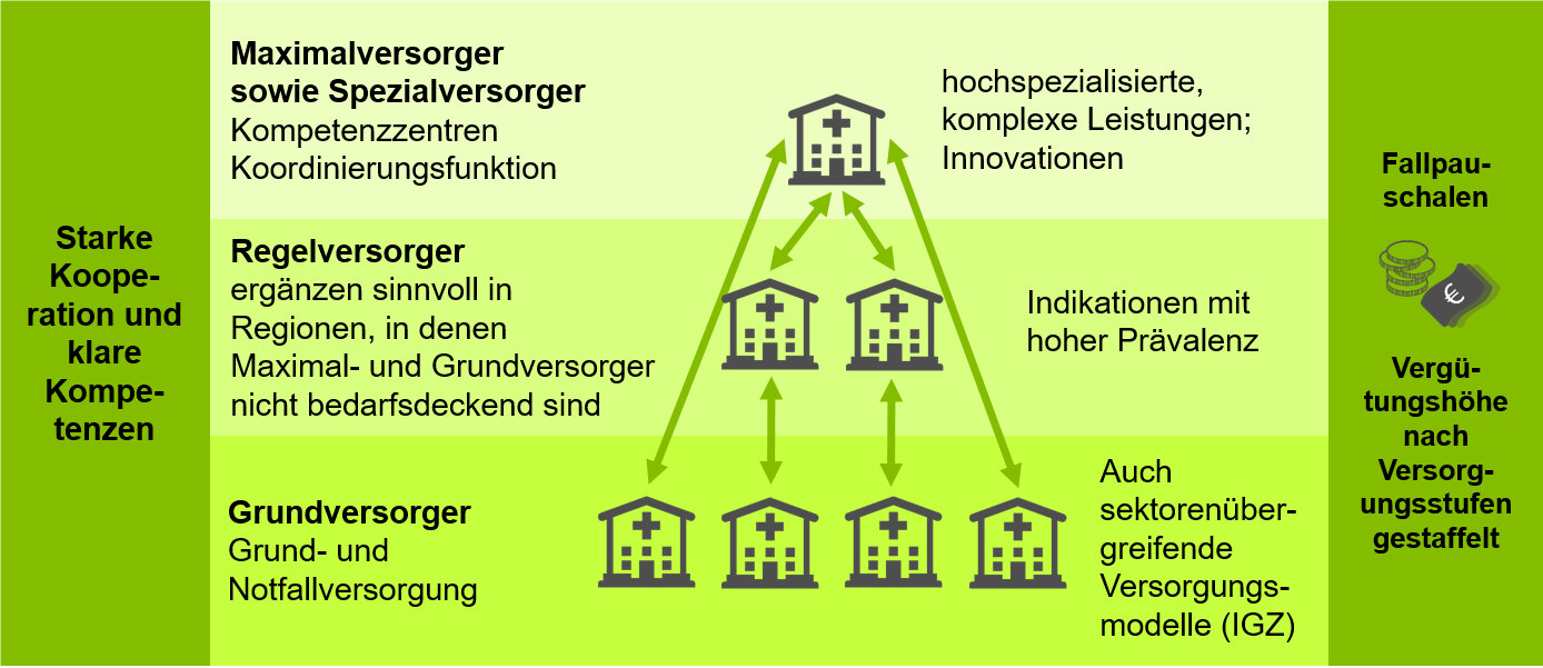 Die Versorgungsstrukturen in Schleswig-Holstein sollten künftig stärker einem gestuften Konzept aus Regel-, Grund- und Maximalversorgern folgen. Dabei werden den Versorgungsstufen konkrete Versorgungsaufträge zugeordnet und somit das Leistungsspektrum der Krankenhäuser eindeutig definiert. Gleichzeitig gelten für die Leistungen in den Versorgungsstufen strikte Anforderungen an die Struktur- und Prozessqualität.