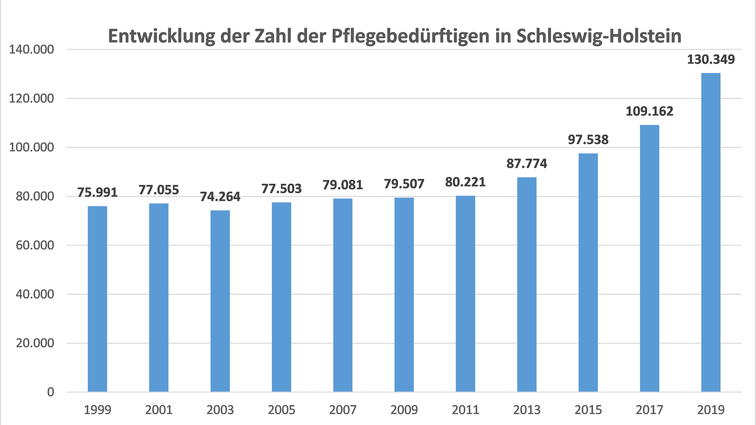 4,5 Prozent der Bevölkerung in Schleswig-Holstein waren Ende 2019 pflegebedürftig. Das entspricht rund 130.000 Menschen. In den letzten zehn Jahren ist die Zahl der Pflegebedürftigen im Land um 65 Prozent angestiegen.