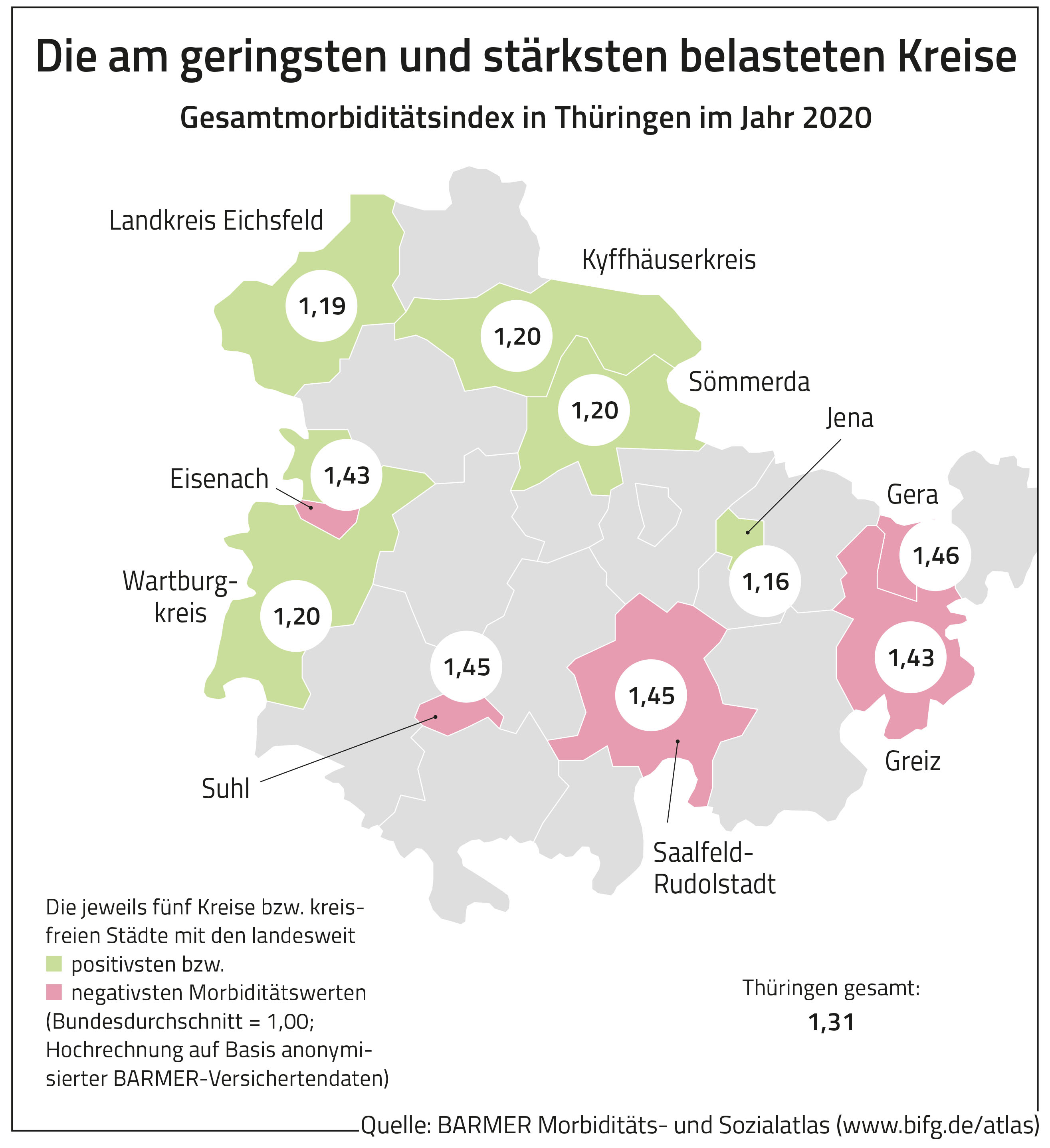 Der Morbiditäts- und Sozialatlas zeigt auf der Basis anonymisierter und standardisierter Versichertendaten auch regionale Unterschiede in den Landkreisen auf. Demnach hat Jena die geringste krankheitsbedingte Gesamtbelastung in Thüringen. Allerdings liegt sie in der Wissenschaftsstadt noch immer 16 Prozent über dem Bundesschnitt. Am schlechtesten schneiden Gera, der Landkreis Saalfeld-Rudolstadt und Suhl ab, die 46 beziehungsweise 45 Prozent über der durchschnittlichen Krankheitslast liegen.