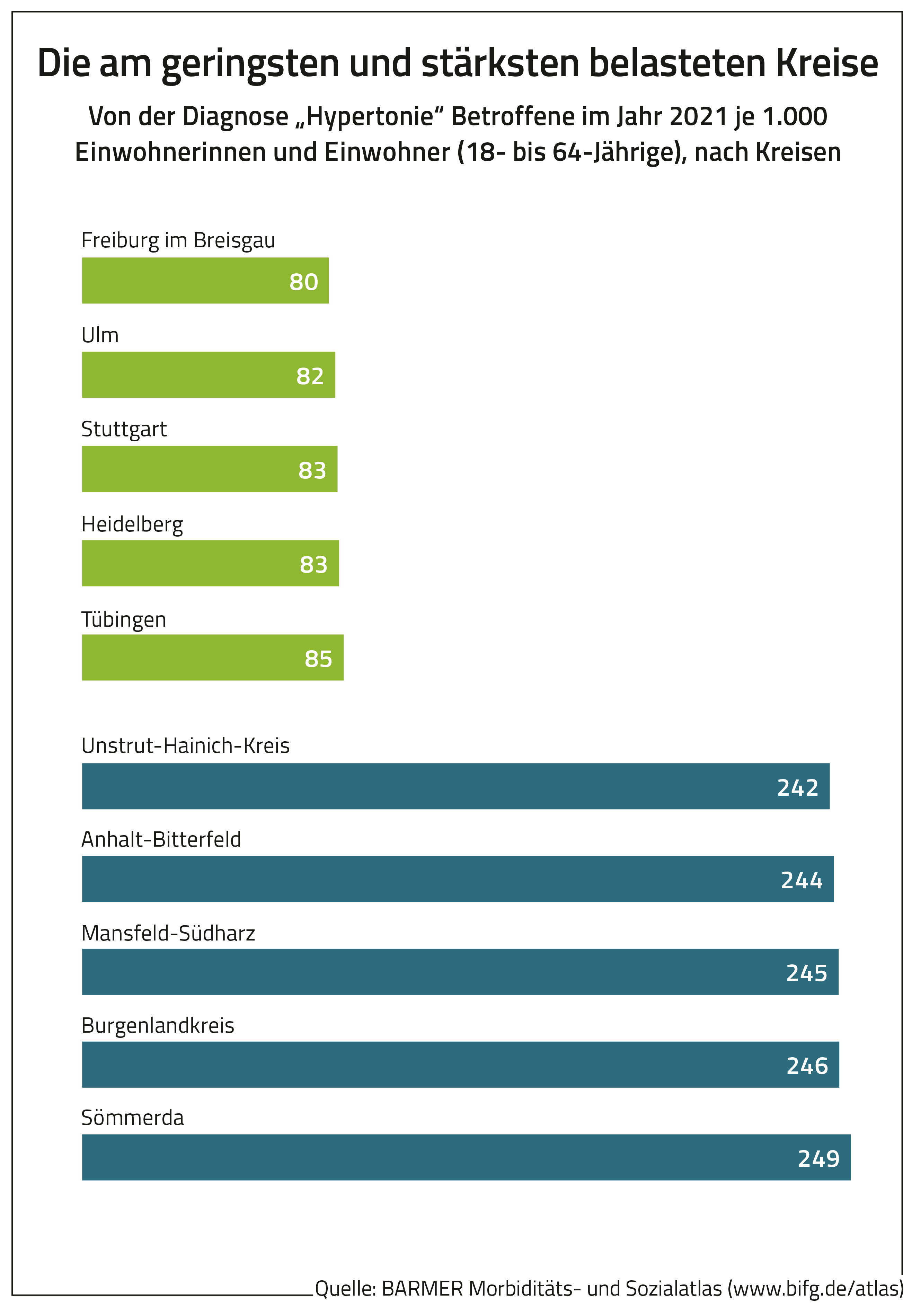 Erfurt, 27. Dezember 2023 – In Thüringen ist der Anteil der Menschen zwischen 18 und 64 Jahren mit Bluthochdruck nach Sachsen-Anhalt bundesweit am höchsten. Dort leiden nachweislich 204 je 1.000 Einwohnerinnen und Einwohner in der genannten Altersgruppe an dieser Krankheit. Damit liegt Thüringen um 46 Prozent über dem Bundesschnitt von 140 je 1.000 Einwohner. Das geht aus dem Atlas des Barmer Instituts für Gesundheitssystemforschung (bifg) zu Hypertonie hervor, der Abrechnungsdaten aus dem Jahr 2021 analysiert hat. Die geringste Krankheitslast gibt es demnach in Jena mit 125 Betroffenen je 1.000 Einwohner. Am stärksten betroffen ist der Kreis Sömmerda mit 249 Erkrankten je 1.000 Einwohner. Dies ist die höchste Rate unter allen kreisfreien Städten und Kreisen in Deutschland.
