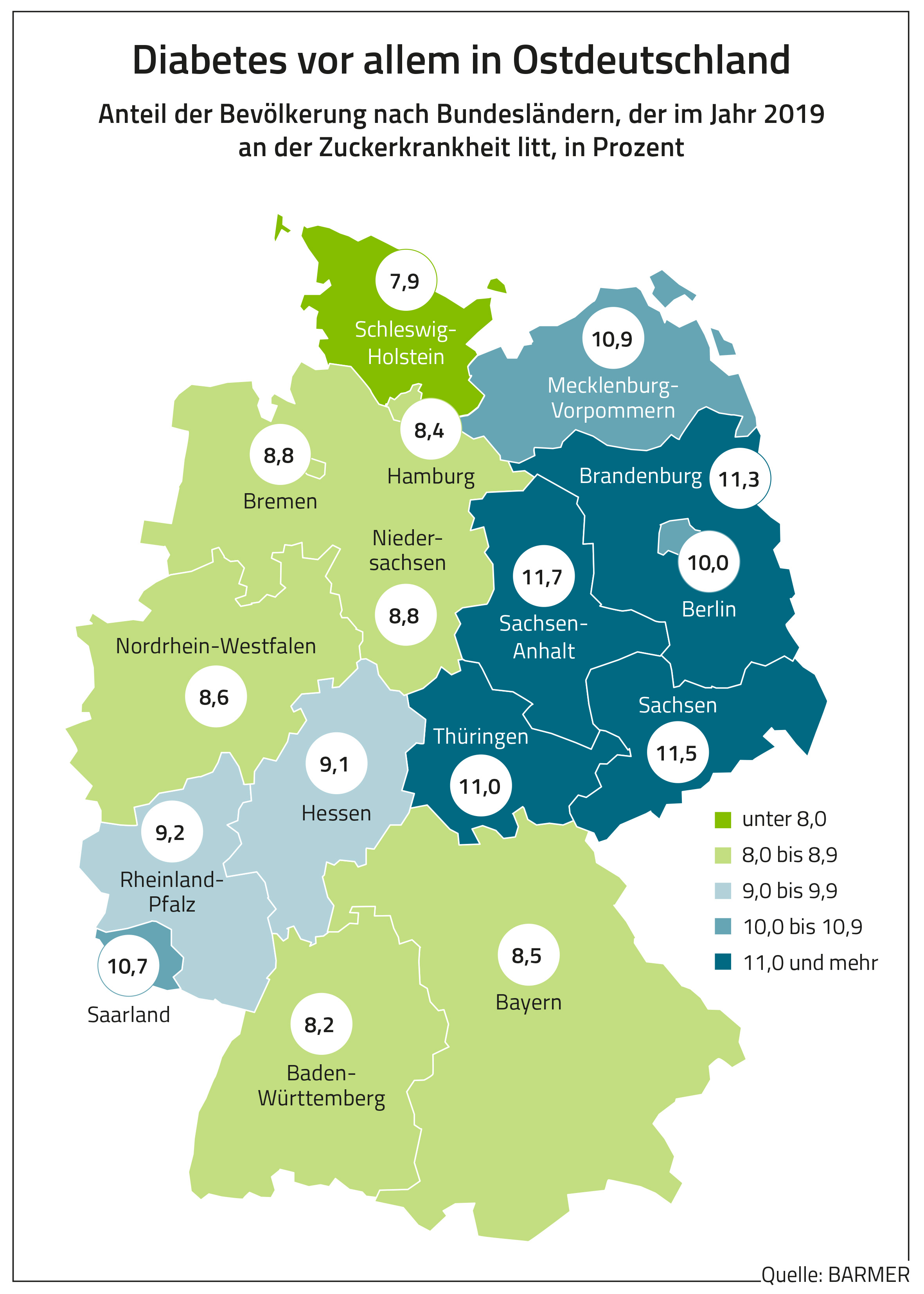 Dem Barmer Diabetes-Atlas zufolge tritt Diabetes mellitus verstärkt in den ostdeutschen Bundesländern auf. Die höchsten Prävalenzraten gab es im vergangenen Jahr in Sachsen-Anhalt mit 11,7 Prozent, Sachsen (11,5 Prozent) und Brandenburg (11,3 Prozent). Dagegen diagnostizierten Ärztinnen und Ärzte nur bei 7,9 Prozent der Einwohnerinnen und Einwohner von Schleswig-Holstein und 8,2 Prozent in Baden-Württemberg die Zuckerkrankheit. Thüringens Barmer-Landeschefin Birgit Dziuk sieht Chancen vor allem beim Thema Ernährungsbildung in Schulen und Kindergärten. „Es gilt, möglichst früh anzusetzen, da sich Essgewohnheiten bereits in der Kindheit manifesteren. Deshalb sollte das Thema gesunde Ernährung in den Schullehrplänen verbindlich verankert werden, damit bereits Kinder dafür sensibilisiert werden“, so Dziuk. Erforderlich seien auch verpflichtende Standards für eine gesunde Kindergarten- und Schulverpflegung.