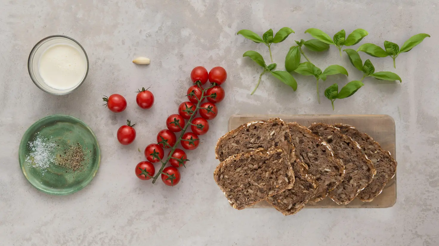 (6) Die Brotscheiben mit der Basilikumbutter bestreichen und in der Pause frisch mit den halbierten Tomaten belegen.