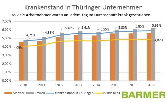 Erfurt, 28. März 2018 – Thüringer Unternehmen mussten im vergangenen Jahr den bundesweit höchsten Krankenstand verkraften. Nach Auswertung der Krankenstatistik aller erwerbstätigen Versicherten der Barmer erreichte die Fehlquote einen Allzeithöchststand von 5,91 Prozent in Thüringen. Bundesweit lag der Krankenstand nur bei 4,8 Prozent, das heißt im Freistaat fehlen rund 20 Prozent mehr Beschäftigte krankheitsbedingt. „Das ist eine reale Belastung für viele Unternehmen. Während wir bundesweit eine leichte Entspannung bei den Krankenständen spüren, bewegt sich Thüringen gegen den Trend. Als Ursache stellen wir deutlich mehr Krankschreibungen wegen Rückenschmerzen und Atemwegserkrankungen fest. Wir möchten die Unternehmen darauf aufmerksam machen, dass es individuelle Beratung zur Gesundheitsförderung am Arbeitsplatz gibt“, sagt Birgit Dziuk, Landesgeschäftsführerin der Barmer in Thüringen.