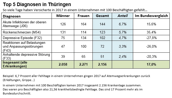 Noch im Jahr 2010 lag der Krankenstand bei nur 4,7 Prozent in Thüringen und ist seitdem kontinuierlich angestiegen (siehe Grafik). „Angesichts der akuten Grippewelle gehen wir in 2018 von einem weiteren Anstieg aus. Allein im letzten Februar lag der Krankenstand in Thüringen bei 9,4 Prozent“, so Dziuk. Trotz saisonaler Schwankungen durch Grippe- und Erkältungswellen sei ein eindeutiger Trend zu beobachten. Die demografische Entwicklung hinterlasse ihre Spuren in Mitarbeiterstruktur und Krankenstatistik. Bemerkenswert ist, dass die absolute Zahl der Krankschreibungen zwar relativ stabil ist, doch die Fehldauer immer länger wird. Im Schnitt dauerte eine Krankschreibung in Thüringen 14,2 Tage. Unter den Hauptdiagnosen stehen Atemwegs- und Rückenerkrankungen, die allein über 12 Prozent aller Fehltage ausmachen (siehe Tabelle). Doch für die langen Fehlzeiten sind vor allem psychische Diagnosen verantwortlich, darunter Depressive Episoden, anhaltende Depressionen und Belastungsstörungen.