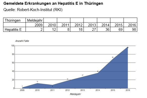 Auch bundesweit entwickeln sich die Zahlen steil nach oben: von 458 Fällen (2013) auf über 1200 im vergangenen Jahr. Die Ursache für den Anstieg ist nicht hinreichend geklärt. Mögliche Gründe sind auch eine größere Aufmerksamkeit der Ärzte sowie bessere Laborverfahren. Nach Angaben des Bundesinstituts für Risikobewertung wurden die Erreger von Hepatitis-E in mehr als 100 verschiedenen Wurstsorten nachgewiesen. Demnach stellen rohe Würste, aber auch Tee- oder Mettwurst ein hohes Risiko dar. Einer Studie zufolge wurden laut Robert-Koch-Institut bei 17 Prozent der deutschen Bevölkerung spezifische Antikörper im Blut gefunden, die auf eine ausgeheilte Hepatitis-E-Infektion hinweisen.