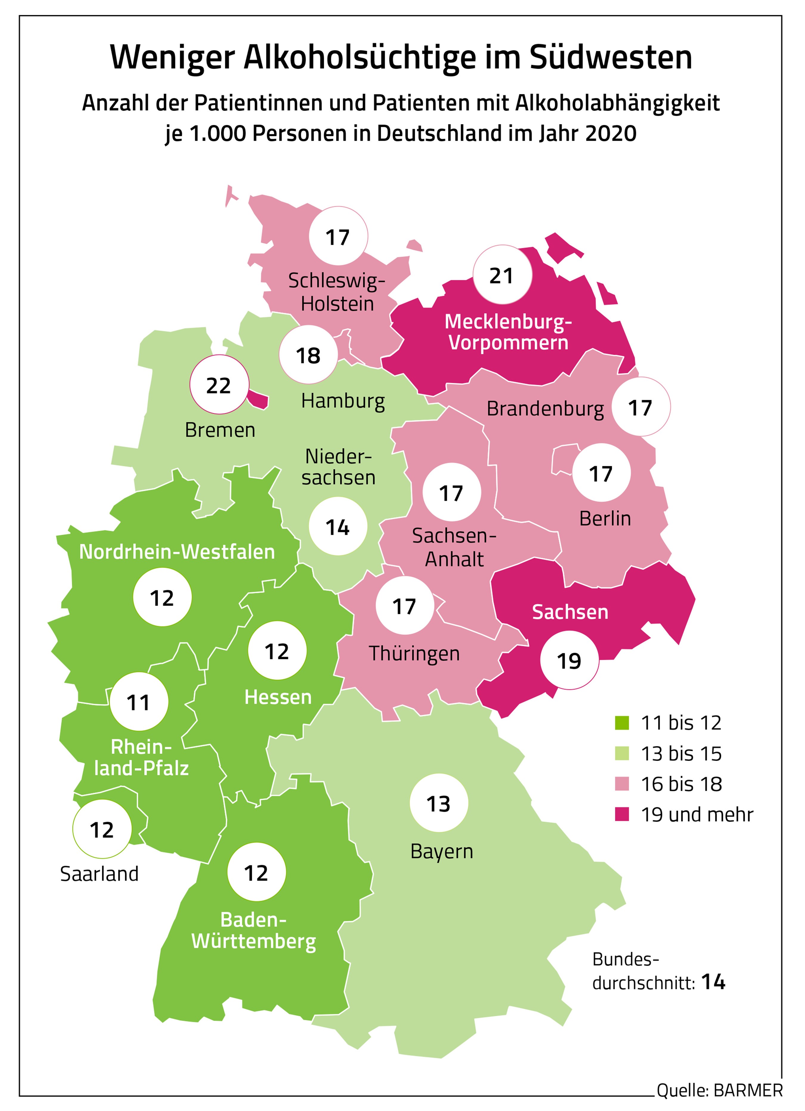Der Barmer-Auswertung zufolge waren vergangenes Jahr hochgerechnet rund 37.000 Menschen erwiesenermaßen alkoholabhängig, davon fast 30.000 Männer. Zudem zeigt die Analyse, dass der Anteil der Alkoholabhängigen in den Altersgruppen ab 50 Jahre um mehr als 60 Prozent höher liegt als bei den 20- bis 50-Jährigen. „Alkoholismus manifestiert sich in der Regel über viele Jahre und kommt vor allem in der Generation der Babyboomer der 50er- und 60er-Jahre vor. Neben individuellen Gründen und Schicksalsschlägen mag auch die Sozialisation eine Rolle spielen. Alkohol hatte damals einen anderen Stellenwert. Heute stehen in der Gesellschaft die Risiken viel stärker im Vordergrund“, sagt Barmer-Landeschefin Birgit Dziuk.