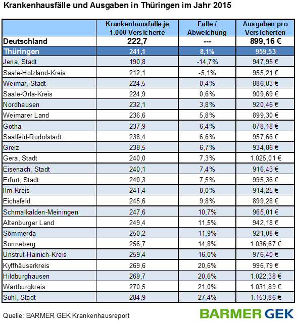 So kommen in Suhl auf 1000 Einwohner rund 285 stationäre Behandlungen – das ist in Thüringen der Spitzenwert und ein Viertel mehr als im Rest der Republik (siehe Tabelle). In Jena beträgt die Häufigkeit dagegen nur 191 Aufenthalte je 1000 Einwohner. Dabei werden die Versicherten nach Wohnortprinzip erfasst und nicht nach Kliniken. Bei diesen zwei Städten ist der Zusammenhang plausibel: Die Suhler sind laut Statistischem Landesamt mit 50 Jahren im Schnitt die ältesten Thüringer, die Jenaer mit 42 Jahren die jüngsten.