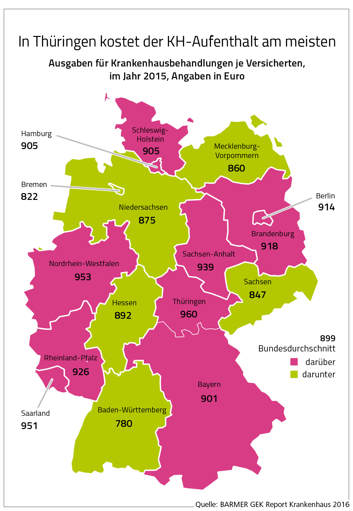 Letztlich führe eine Mengenausweitung auch zu steigenden Kosten. Pro Versichertem hat die Barmer GEK im vergangenen Jahr in Thüringen 960 Euro für stationäre Behandlungen ausgegeben. Das waren 6 Prozent mehr als im Vorjahr (908 Euro). Auch in diesem Ranking belegt Thüringen bundesweit den ersten Platz. Selbst in Sachsen, das eine vergleichbare demografische Struktur hat, waren es über 100 Euro weniger.