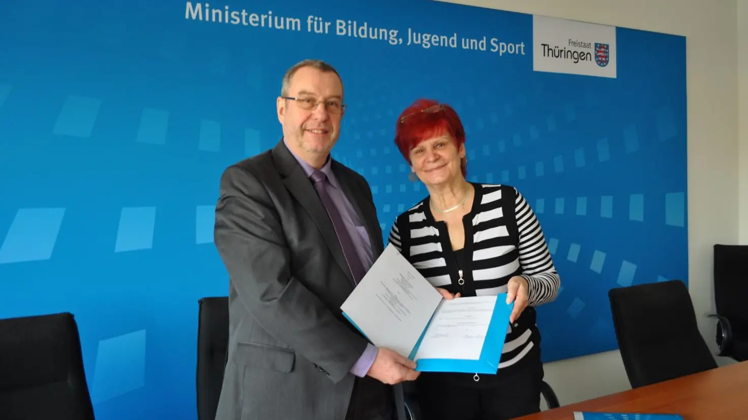 Bildungsministerin Birgit Klaubert und Landesgeschäftsführer Hermann Schmitt bei der Unterzeichnung.